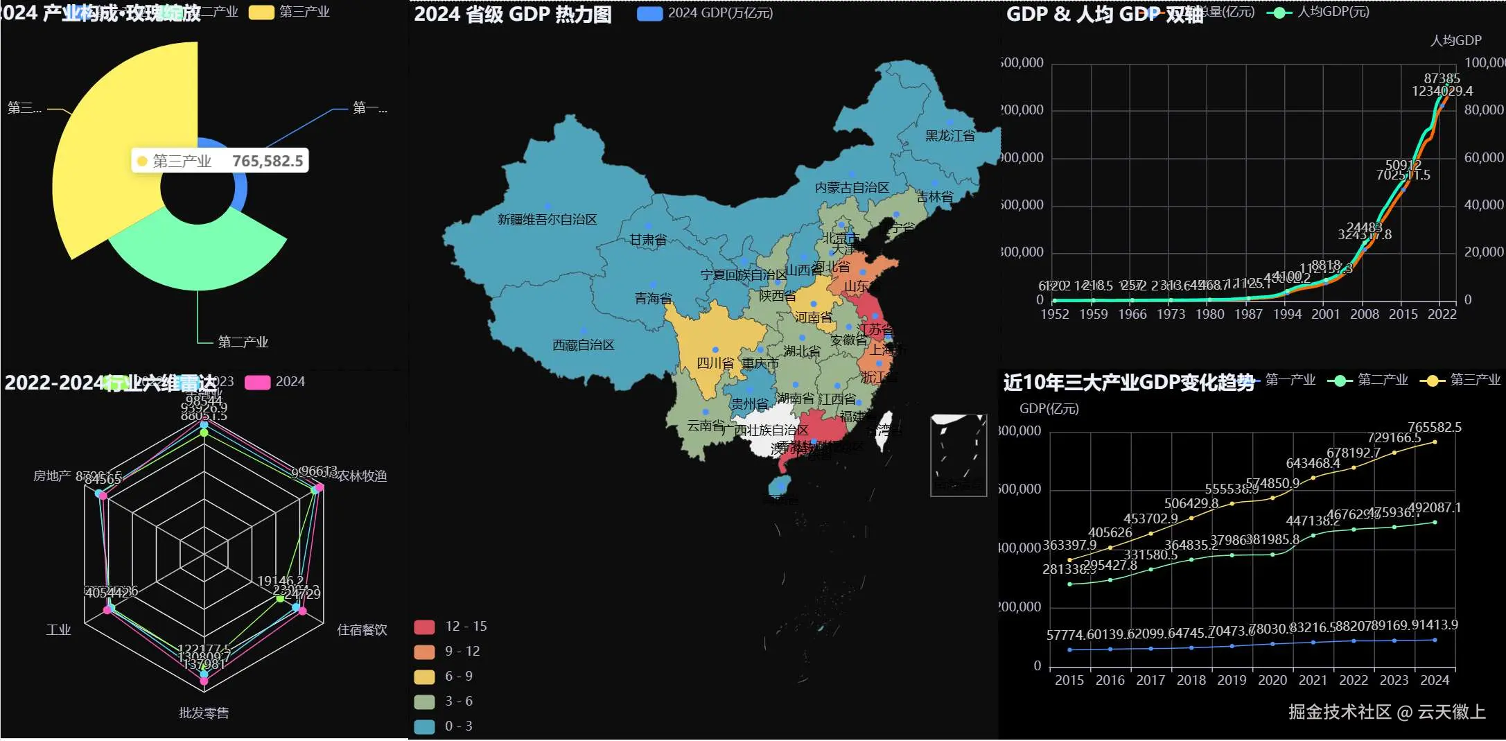 通过上述可视化分析,我们可以清晰地看到中国历年GDP的变化趋势和产业构成。玫瑰图展示了2024年的产业构成,地图和柱状图展示了GDP的时空分布,双轴折线图和雷达图则分别展示了GDP总量与人均GDP的变化以及各行业的GDP贡献。