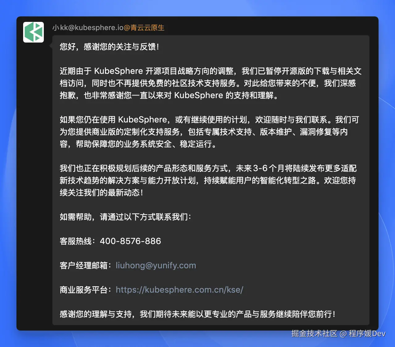 一张截图在技术交流群里迅速传开——那是 KubeSphere 官方宣布后续版本闭源、并停止免费社区支持的公告。