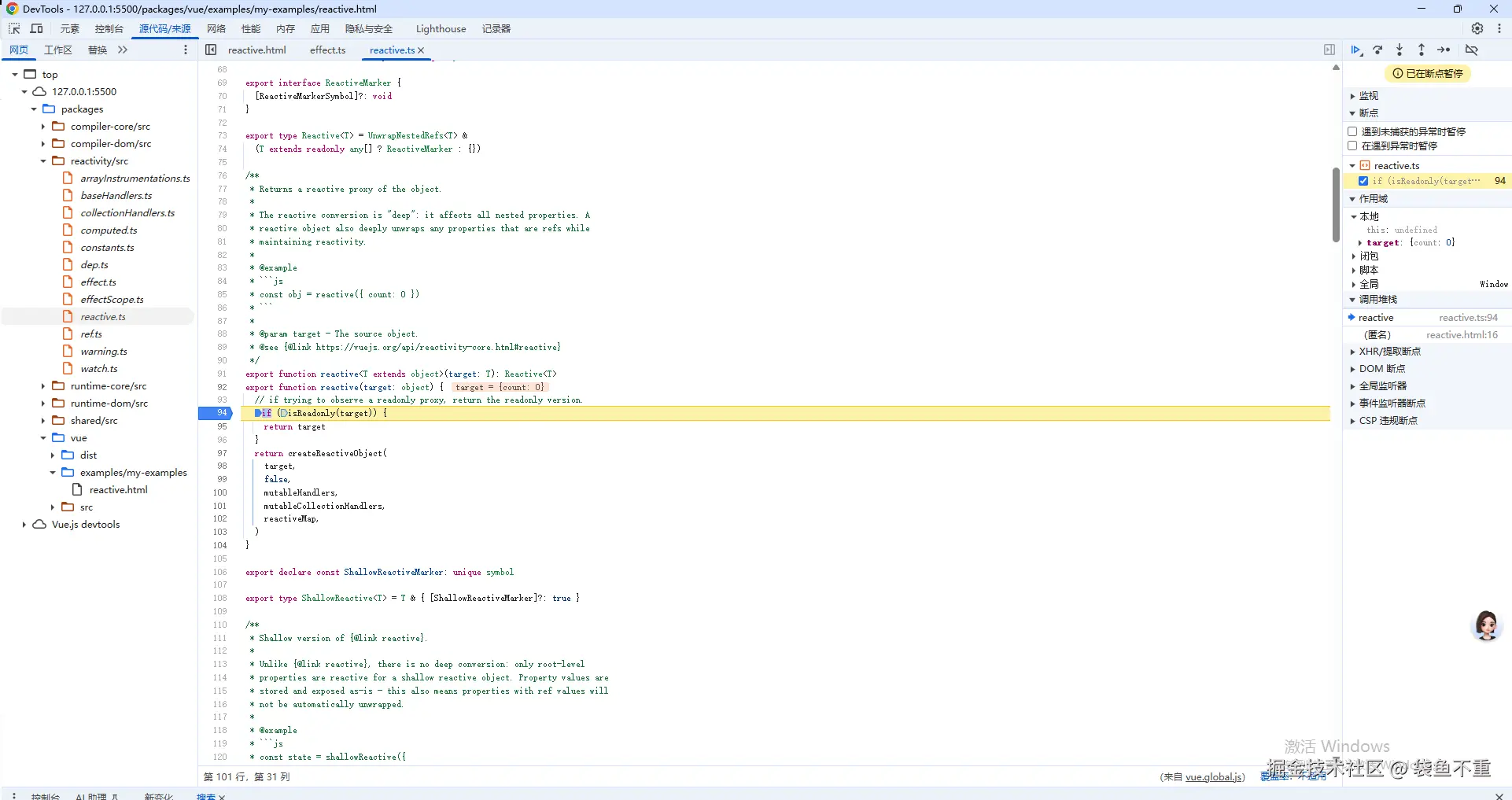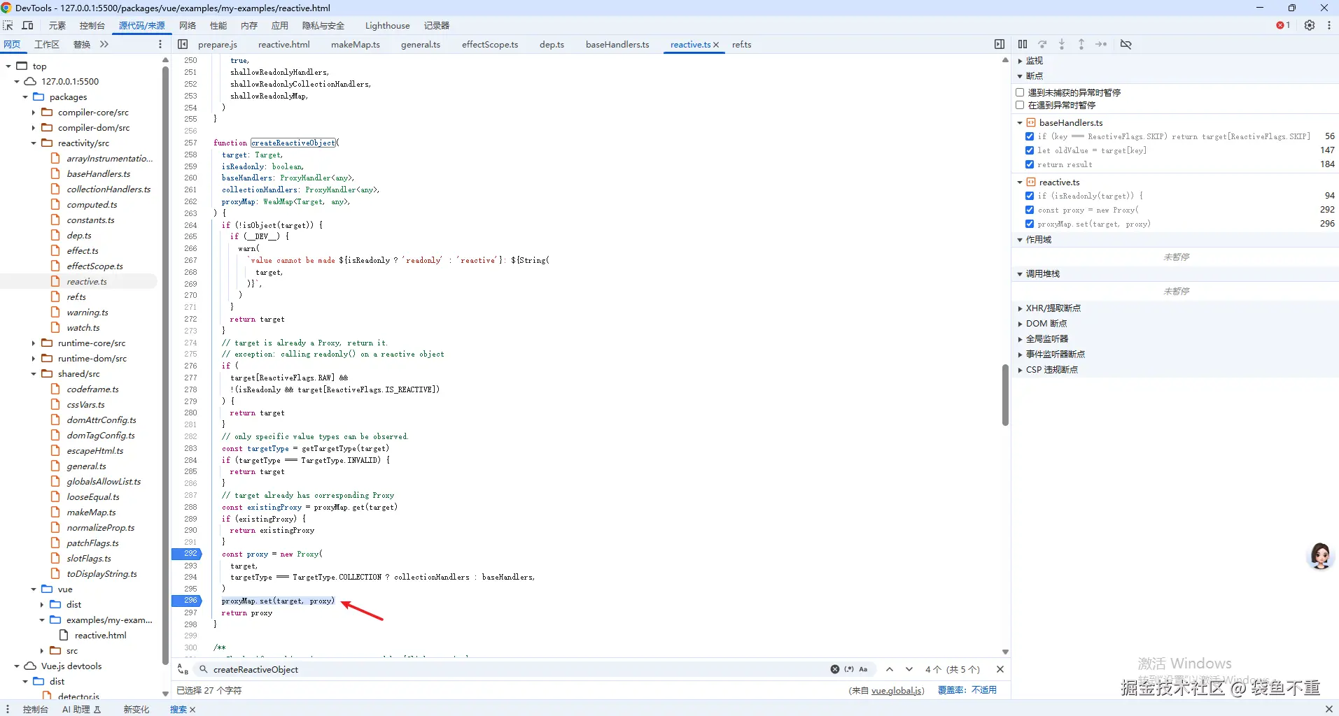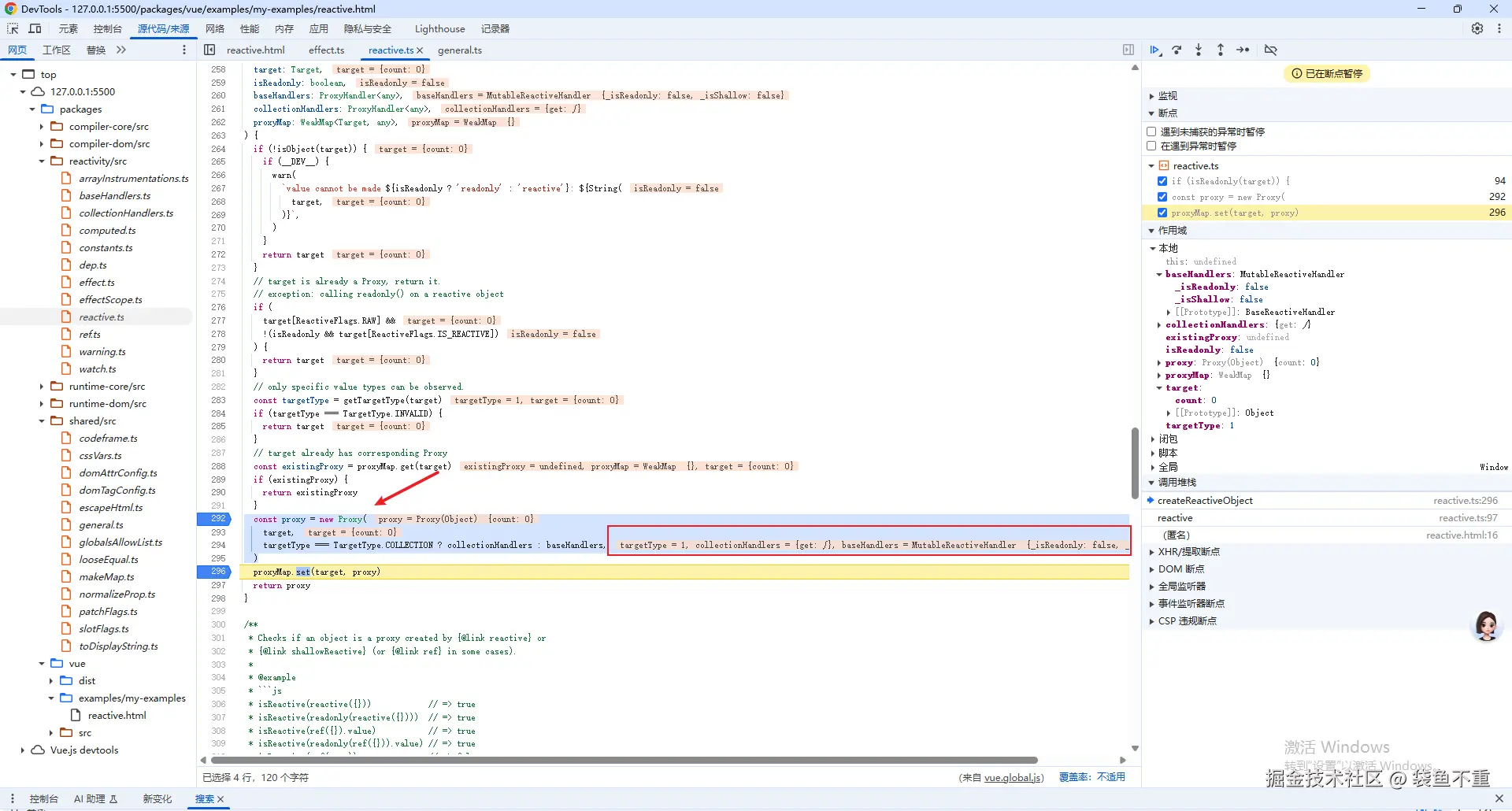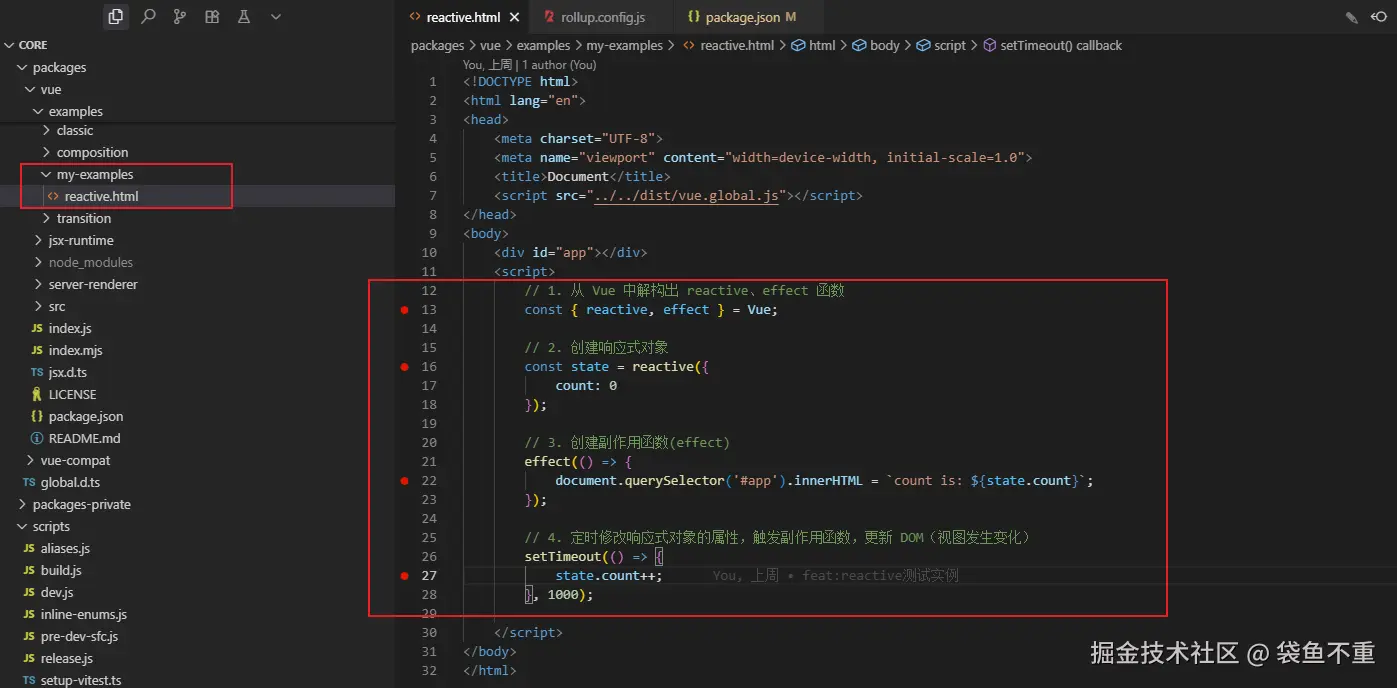 记得我们在 2.3(手把手搭建Vue轮子从0到1:2. 搭建框架雏形)节 中构建的测试实例 reactive 吗?我们在里面打断点,看看 reactive 究竟做了什么。
