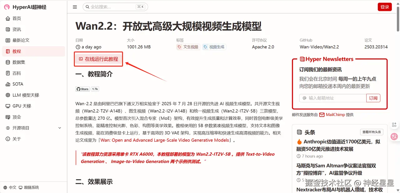 1. 进入 hyper.ai 首页后,选择「教程」页面,并选择「Wan2.2:开放式高级大规模视频生成模型」,点击「在线运行此教程」。