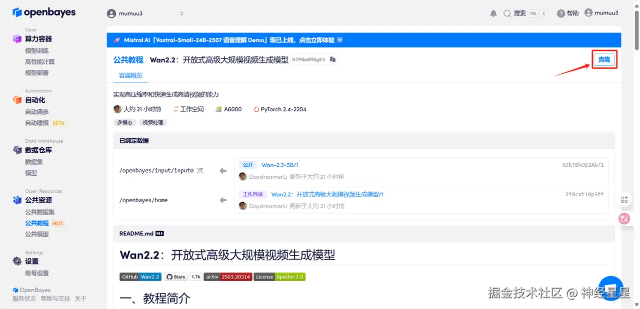 - 页面跳转后,点击右上角「克隆」,将该教程克隆至自己的容器中。