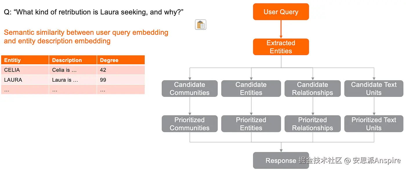 然后,用户查询会被转换为嵌入向量,并计算其与每个实体描述的嵌入向量之间的语义相似度。