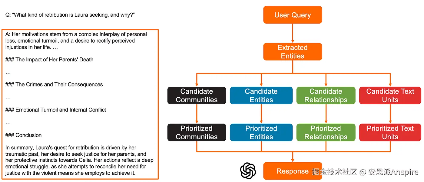 - 最后,经过优先级排序的社区报告、实体、关系和文本单元的描述——按此顺序——会被拼接起来,作为上下文提供给LLM,由LLM生成对用户查询的详细回答。