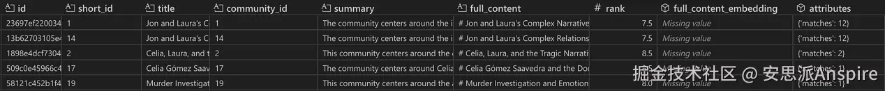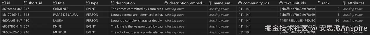 与用户查询语义最相似的实体快照。在这个示例中,top_k_mapped_entities=10,因此过采样后本应检索到20个实体,但只有17个具有有效ID,所以实际检索到17个实体。rank列显示实体节点的度数。