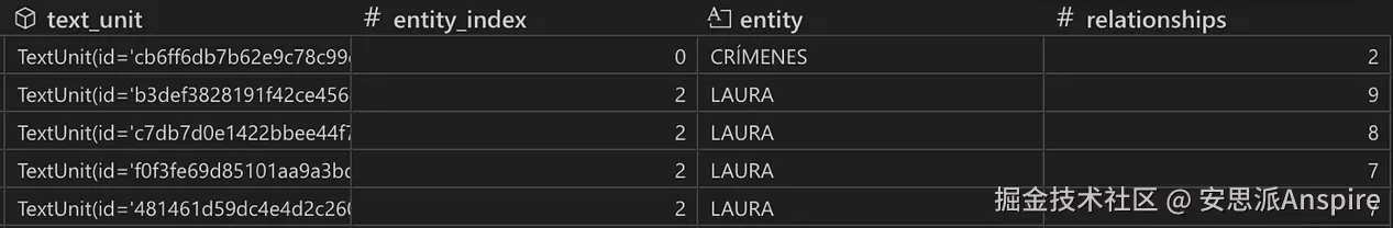 - 候选文本单元按提取实体的顺序排序,其次按与该文本单元相关联的提取实体关系数量排序。实体顺序确保了提及与用户查询语义最相似的实体的文本单元被优先考虑。例如,如果Crímenes是与用户查询语义最相似的实体,而文本单元CB6F…是提取出Crímenes的文本块,那么即使与该文本单元相关联的提取实体关系很少,CB6F…也会排在列表顶部。