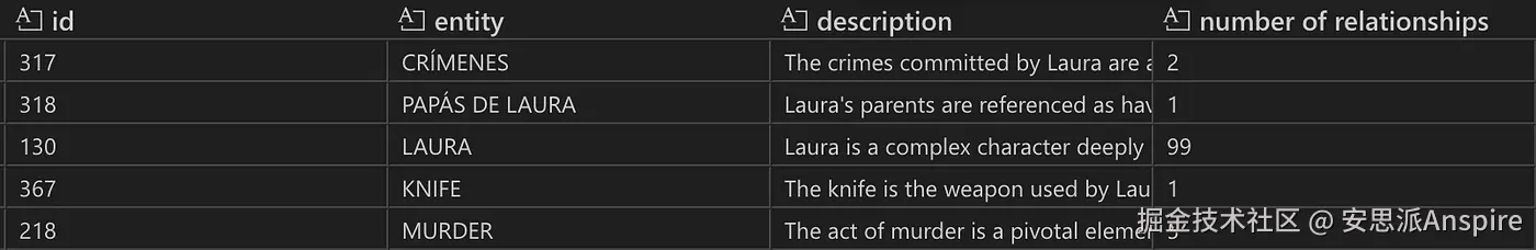 网络外关系表示例。rank列显示组合度数,attributes列显示外部实体与内部实体(Crímenes、Papás de Laura和Laura)的链接数量。