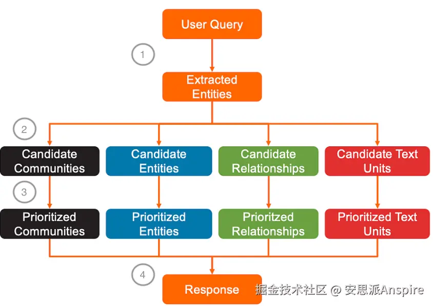 - 所有提取的实体都成为候选实体。提取实体所属的社区、关系和文本单元则分别成为候选社区、候选关系和候选文本单元。