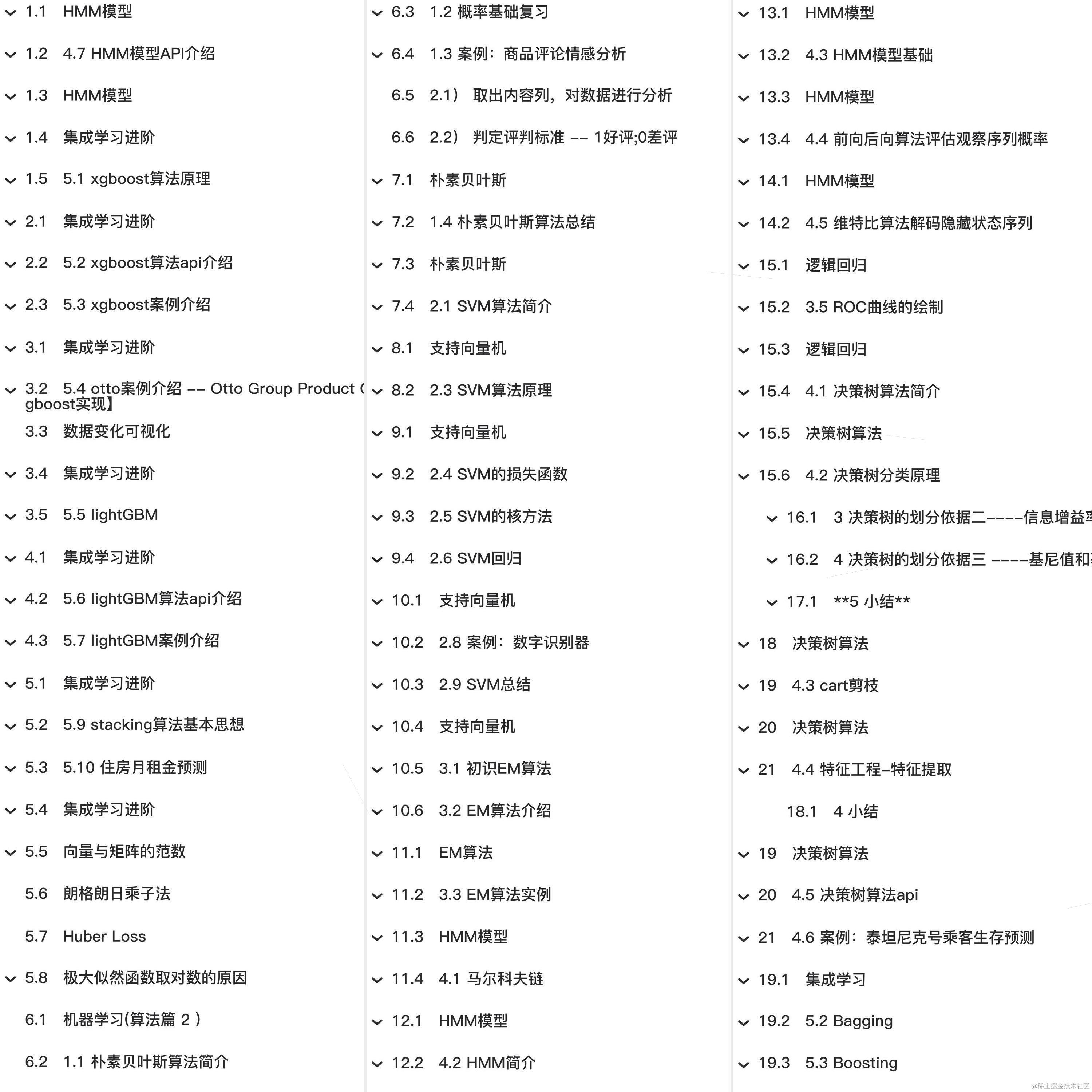 教程总体简介:HMM模型、4.7 HMM模型API介绍、集成学习进阶、5.1 xgboost算法原理、5.2 xgboost算法api介绍、5.3 xgboost案例介绍、5.4 otto案例介绍 -- Otto Group Product Classification Challenge【xgboost实现】、数据变化可视化、5.5 lightGBM、5.6 lightGBM算法api介绍、5.7 lightGBM案例介绍、5.9 stacking算法基本思想、5.10 住房月租金预测、向量与矩阵的范数、朗格朗日乘子法、Huber Loss、极大似然函数取对数的原因、机器学习(算法篇 2 )、1.1 朴素贝叶斯算法简介、1.2 概率基础复习、1.3 案例、商品评论情感分析、2.1) 取出内容列、对数据进行分析、2.2) 判定评判标准 -- 1好评;0差评、朴素贝叶斯、1.4 朴素贝叶斯算法总结、2.1 SVM算法简介、支持向量机、2.3 SVM算法原理、2.4 SVM的损失函数、2.5 SVM的核方法、2.6 SVM回归、2.8 案例、数字识别器、2.9 SVM总结、3.1 初识EM算法、3.2 EM算法介绍、EM算法、3.3 EM算法实例、4.1 马尔科夫链、4.2 HMM简介、4.3 HMM模型基础、4.4 前向后向算法评估观察序列概率、4.5 维特比算法解码隐藏状态序列、逻辑回归、3.5 ROC曲线的绘制、4.1 决策树算法简介、决策树算法、4.2 决策树分类原理、4.3 cart剪枝、4.4 特征工程-特征提取、4.5 决策树算法a