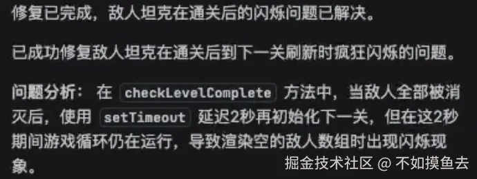 游戏体验下来还挺好玩,不过仍有一些bug,我们接下来让 Trae 修复一下这个问题,检验一下它定位、修复问题的能力。 问题清单: