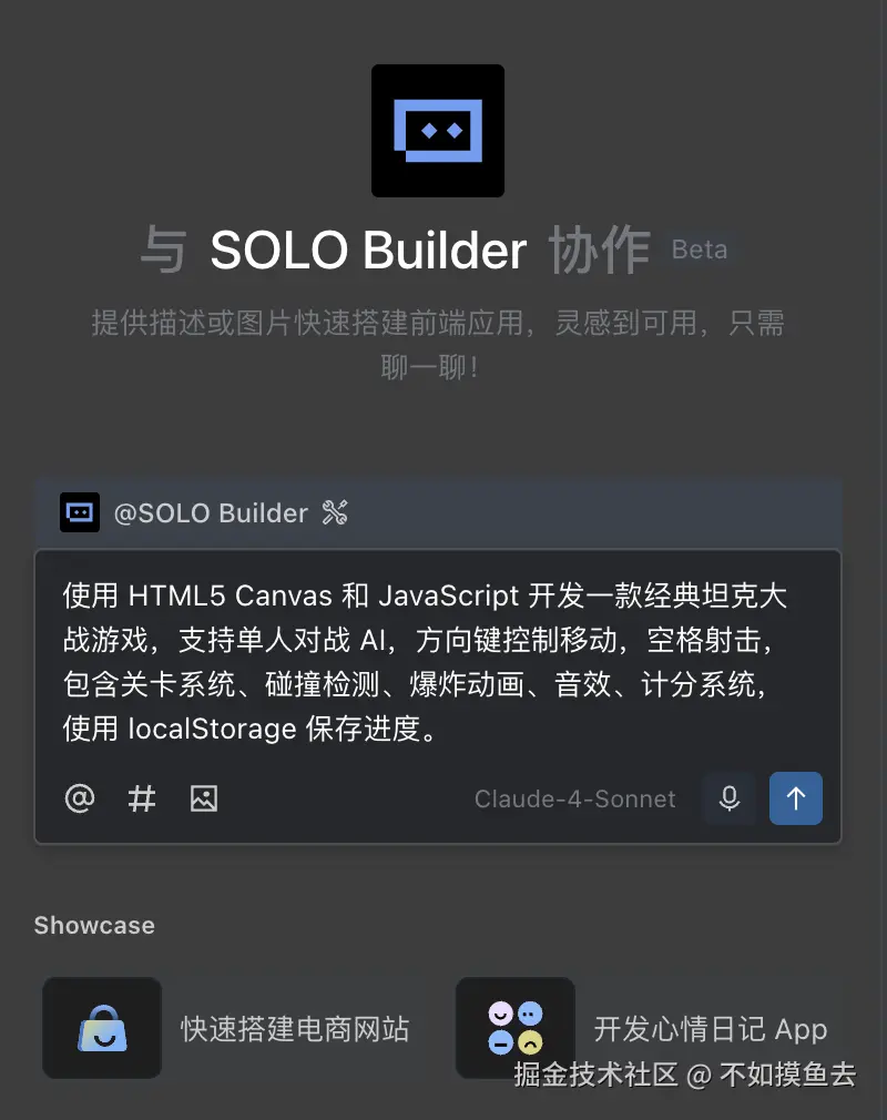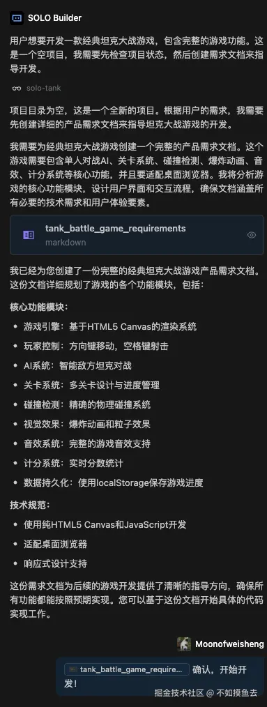 7 月 21 日,#TRAE2.0SOLO出道,TRAE 国际版 SOLO 模式已全面上线。SOLO 是行业首个 Context Engineer,不仅能协助编码,更能基于精准上下文理解和工具调用,从构思、规划、开发到上线,自主驱动开发全流程。使用 Trae Solo 我们可以体验由AI主导开发,从输入到交付的全链路协同的开发模式,这十分符合本次我们要复刻坦克大战的目标,儿时的我可不会开发游戏,这在我看来是一件非常酷的事情!