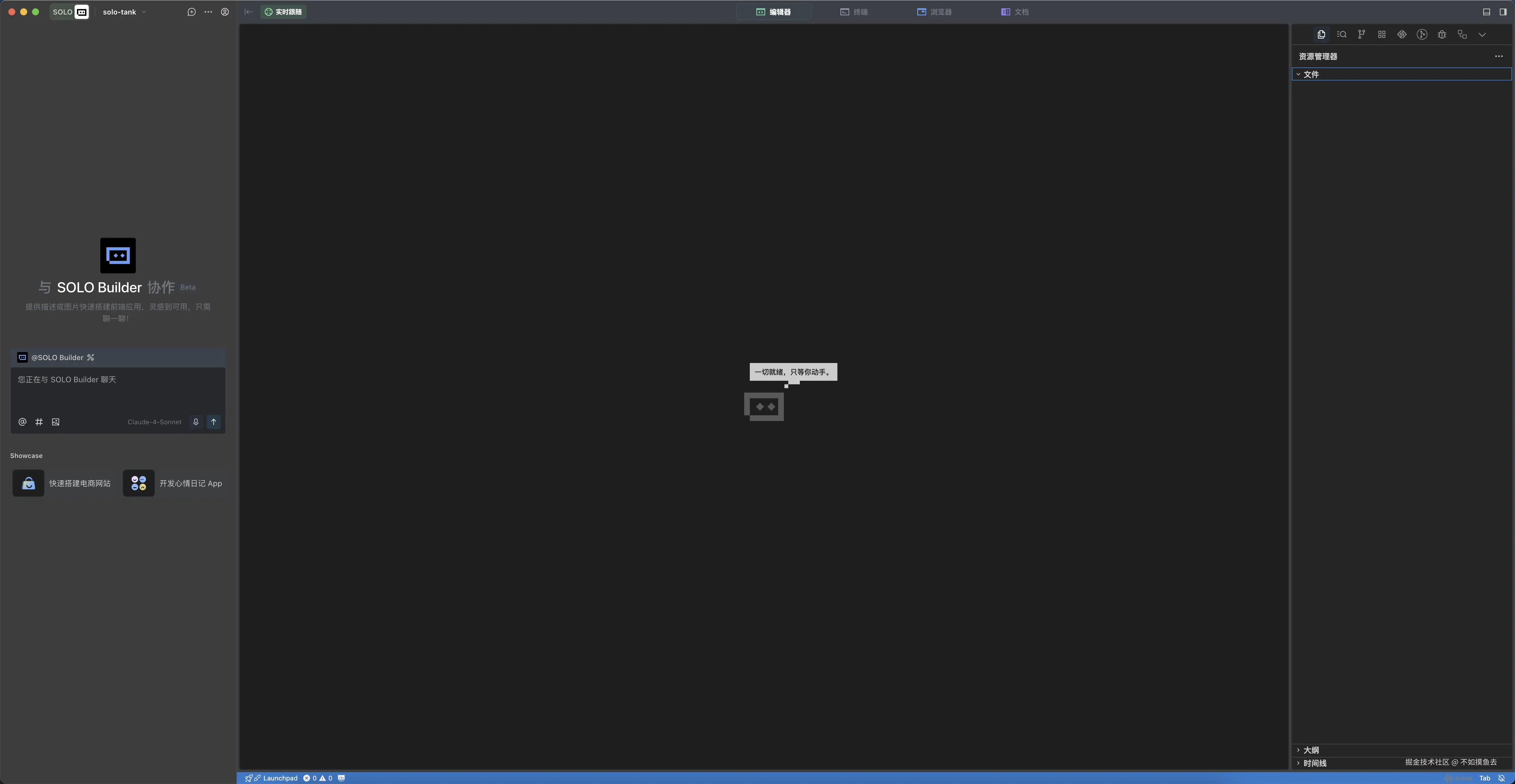 切换之后他长这个样子,将AI聊天窗口移动到了左侧,中间可以切换编辑器、终端、浏览器和文档,而右侧则是资源管理器等,这也比较符合