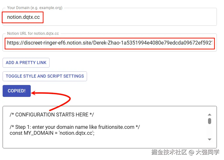 打开这个网站:点击打开 填写你的自定义域名与notion分享链接,之后复制生成的代码,粘贴的修改代码的区域