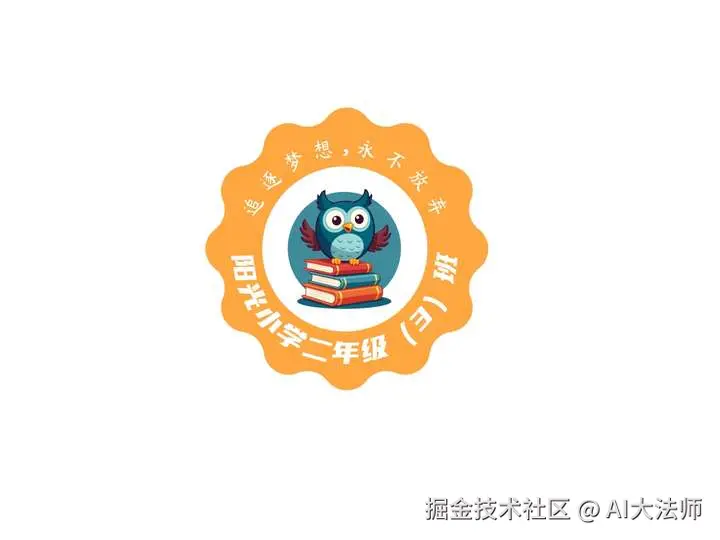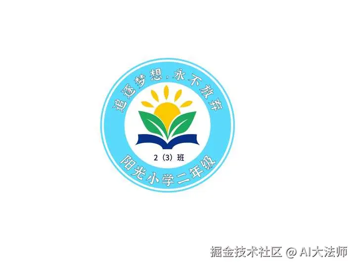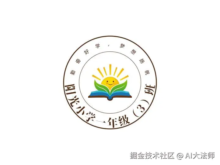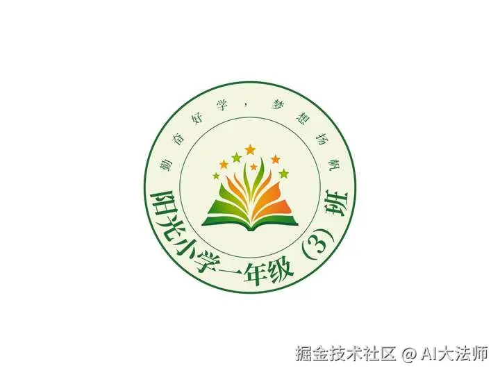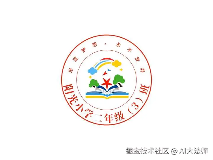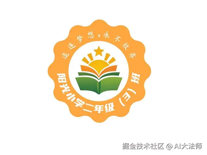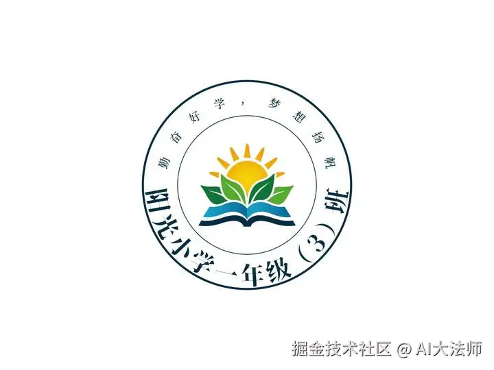 6、阳光小学二年级(3)班的班徽,该班徽包含了书本、太阳、星星元素 。文字体现班级理念与归属,书本象征知识探索,太阳代表活力希望,星星寓意引领与闪耀,传达班级逐梦向上、乐学进取的精神 。