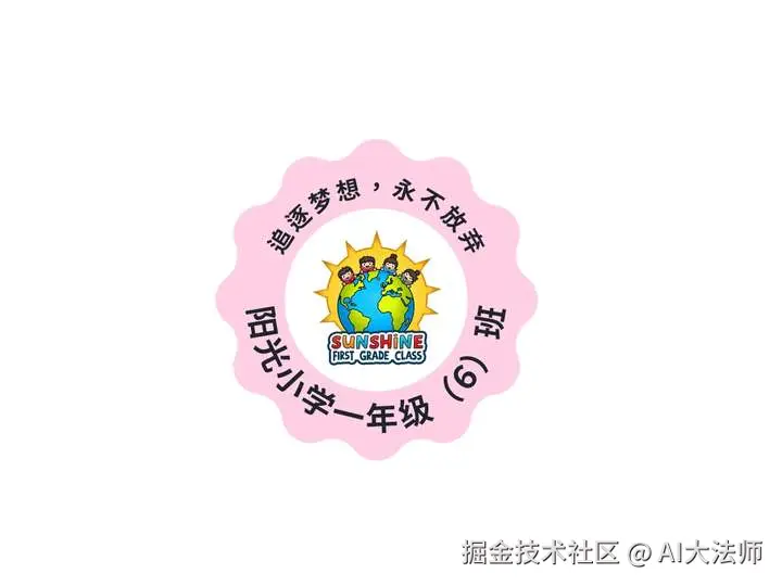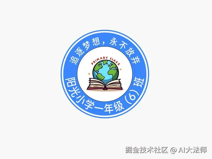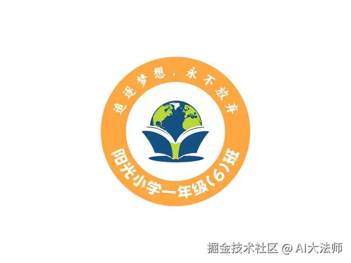 28、这是阳光小学一年级(6)班的班徽,包含地球、书本、文字“追逐梦想,永不放弃”“阳光小学一年级(6)班” 元素。