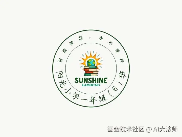 18、这是阳光小学一年级(6)班的班徽,包含地球、书本、太阳光芒、文字“追逐梦想,永不放弃”“阳光小学一年级(6)班”及 “SUNSHINE ELEMENTARY” 元素。地球象征广阔视野,书本寓意知识积累,太阳光芒代表活力与希望,文字传递班级逐梦、坚持的精神与身份信息 。