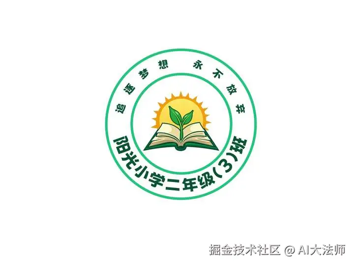 8、阳光小学二年级(3)班的班徽,该班徽包含了太阳、绿叶、书本元素。文字传递班级信念与身份,太阳象征活力希望,绿叶寓意成长生机,书本代表知识探索,整体展现班级逐梦向上、乐学进取的精神 。