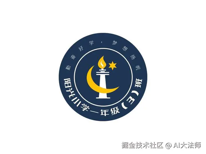 10、这是阳光小学一年级(3)班的班徽,包含了灯塔、火焰、月亮、星星元素。文字传递班级理念与身份,灯塔象征指引方向,火焰代表热情与求知,月亮、星星营造美好氛围,整体展现班级在知识指引下,以勤奋为帆逐梦前行的精神 。