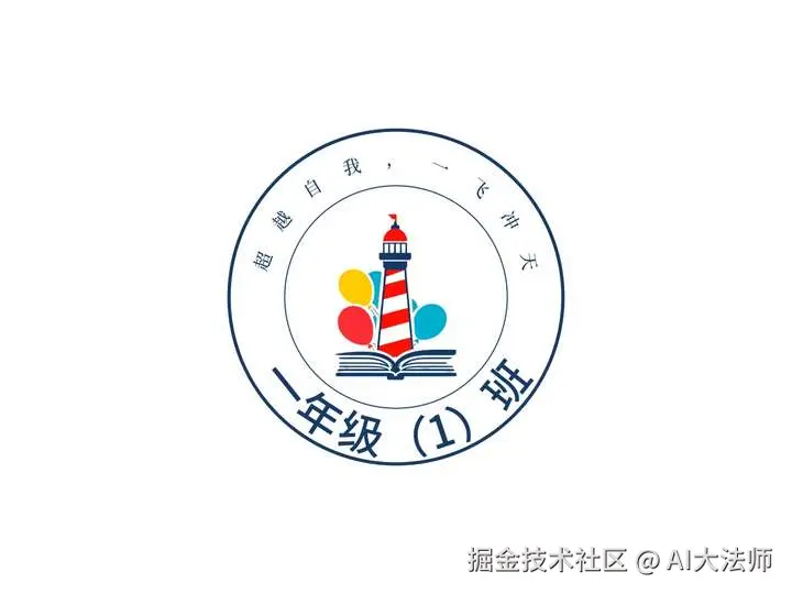 29、这是一年级(1)班的班徽,包含灯塔、气球、书本、文字“超越自我,一飞冲天”“一年级(1)班”元素。灯塔象征指引方向,寓意班级有明确目标;气球代表活力与希望;书本象征知识学习 。