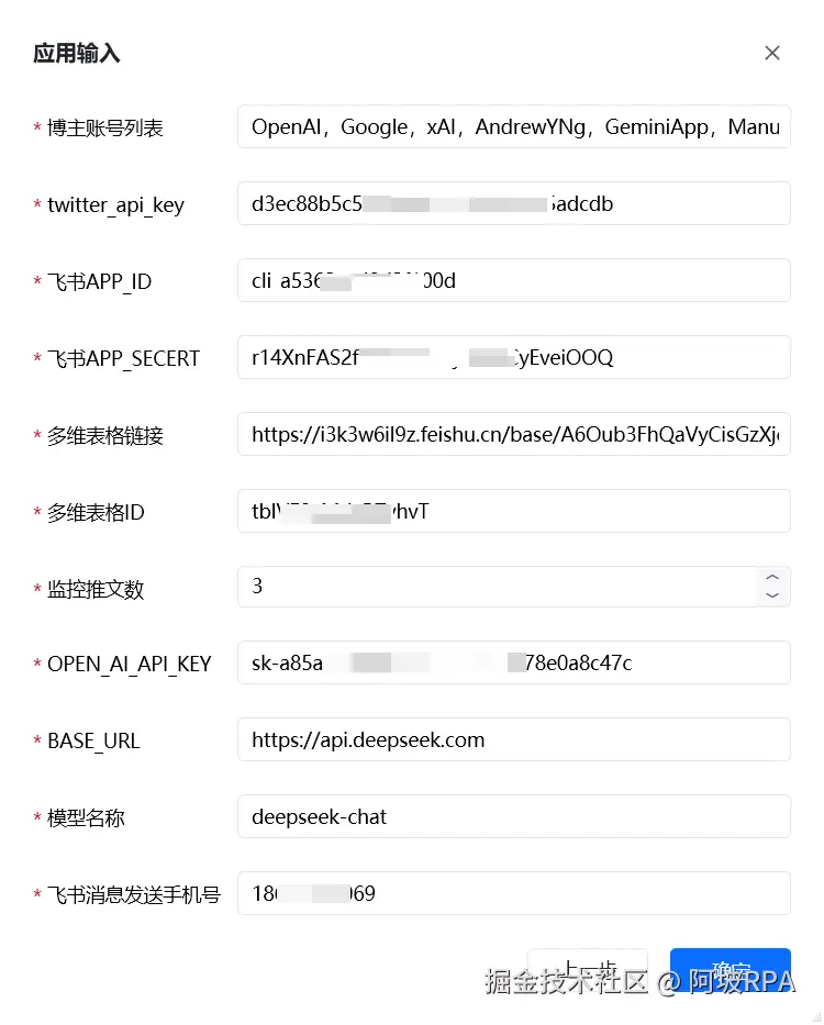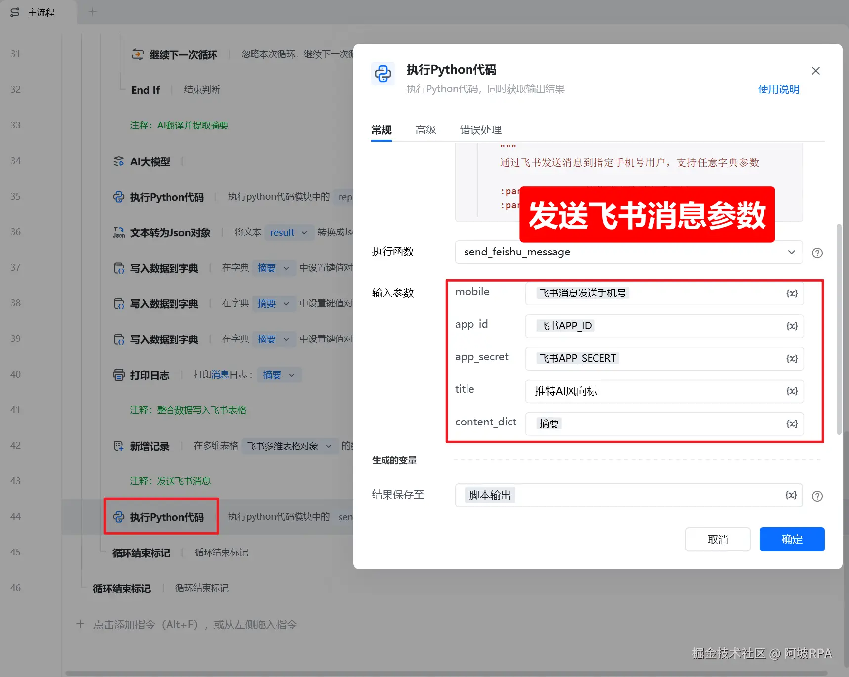 AI 提示词大家可以自己定义,也可以用我的提示词,这里就不在粘贴了,大家需要的话可以关注公众号:阿坡RPA,后台回复关键词风向标 自动获取本流程相提示词,代码源码等相关素材