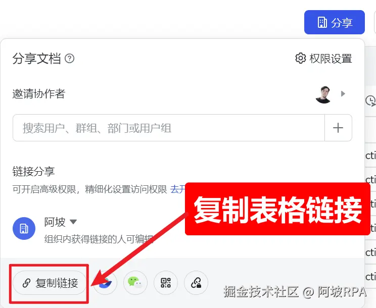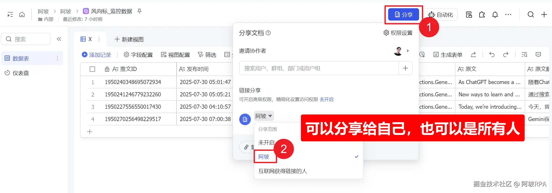 创建完多维表格后,需要分享表格,可以分享给自己,也可以分享给互联网所有人,总之需要分享一下接口才可以调用成功: