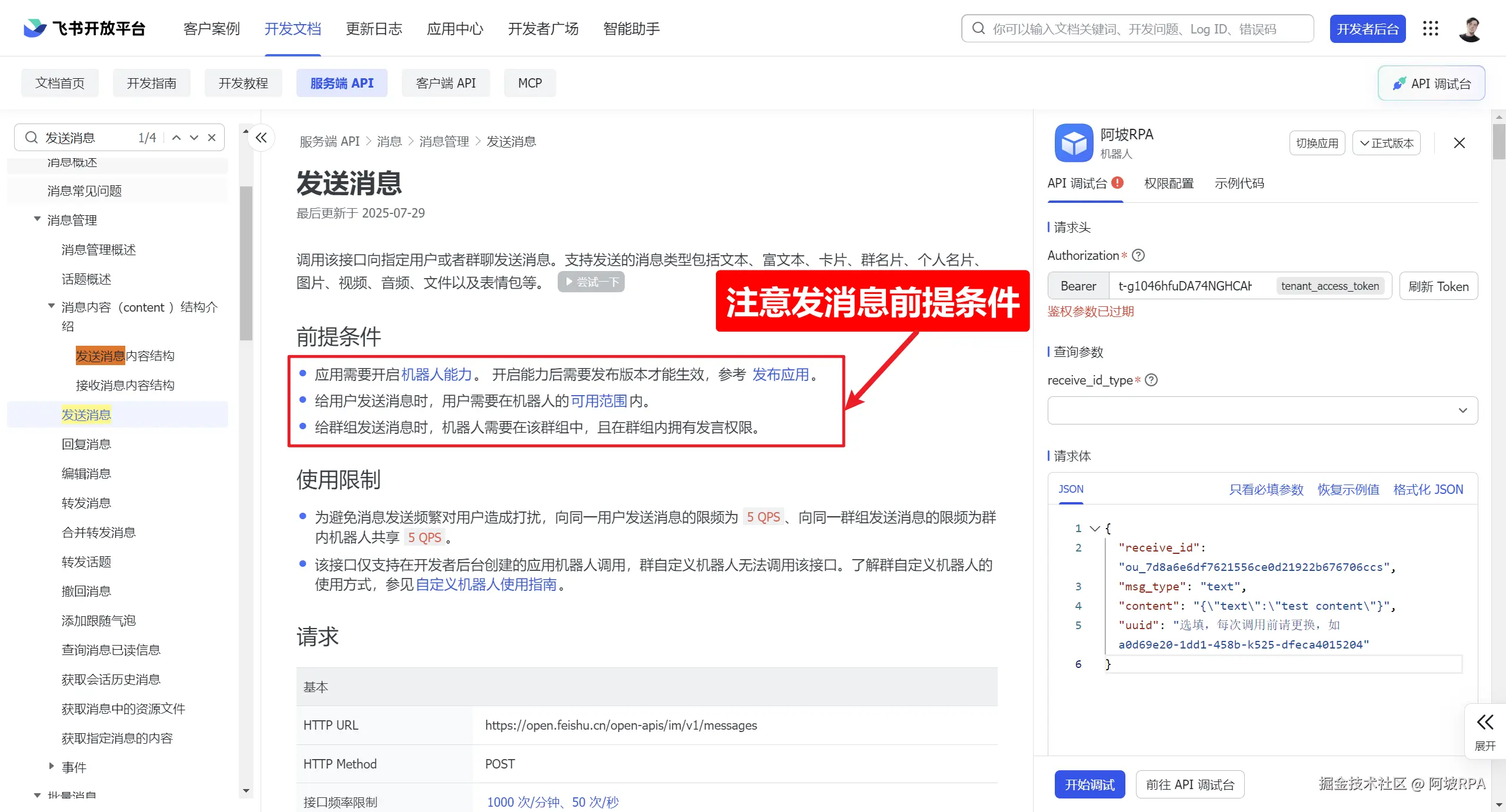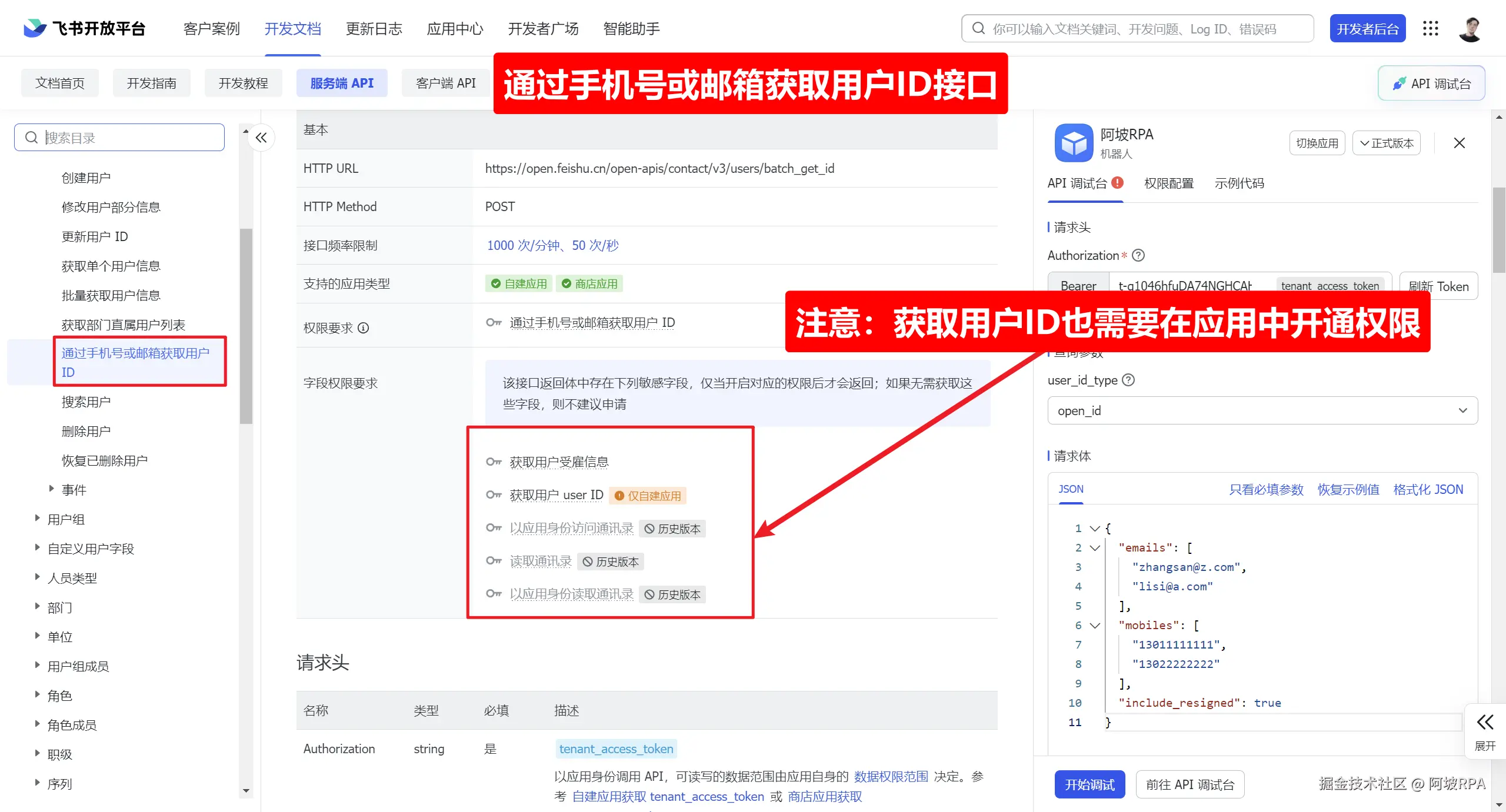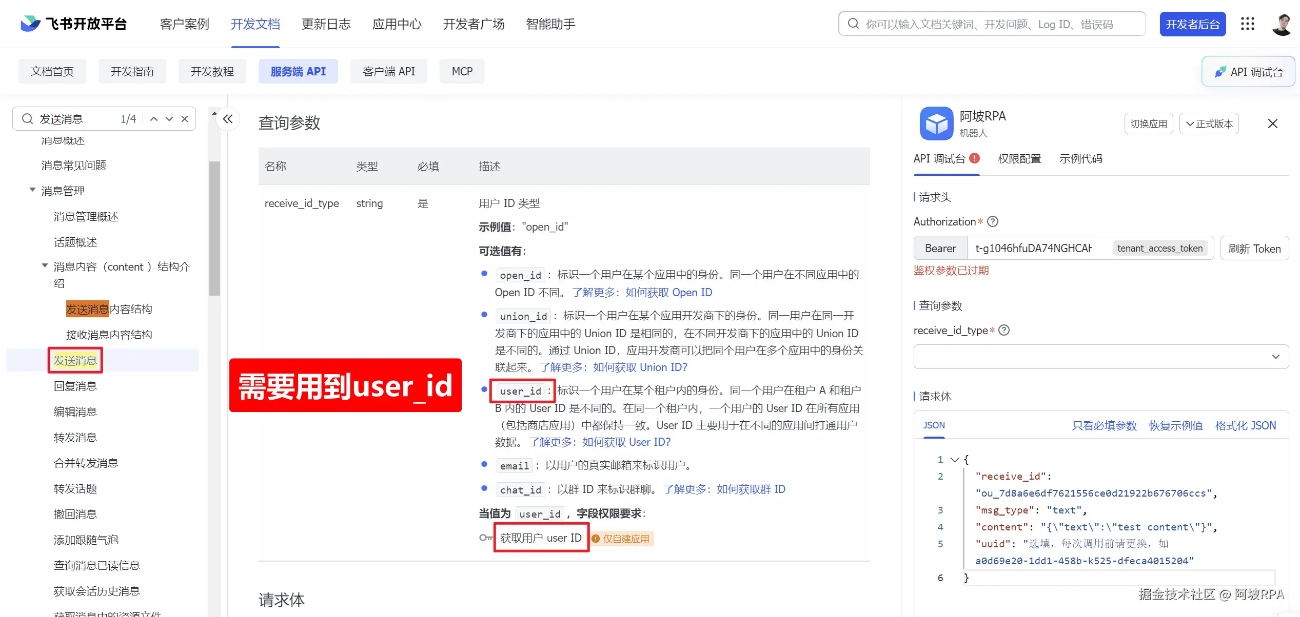 前面讲过,发送飞书消息,需要先根据用户手机号,获取用户ID,因为调用发送消息接口需要用到该参数: