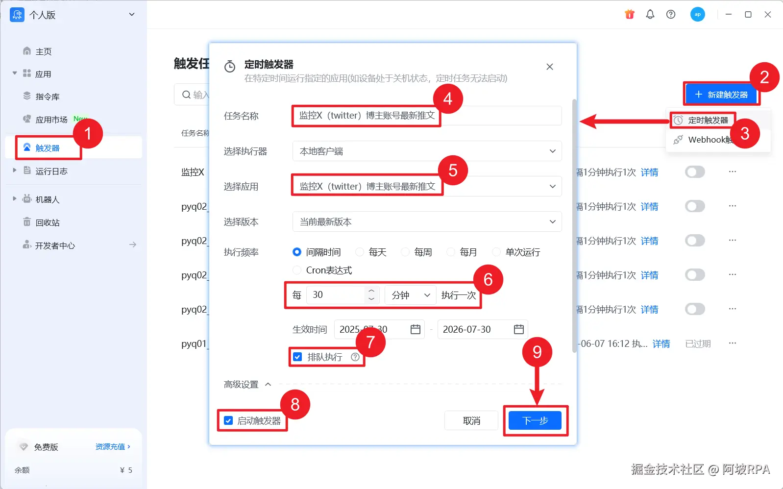 既然是监控,当然少不了定时触发器,八爪鱼RPA的触发器非常灵活,对小白非常友好