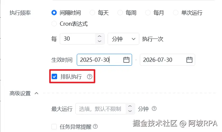 如果多个定时任务,不巧在同一个时间段拥堵了,还支持排队执行,避免多个任务同时占用电脑资源,造成流程报错: