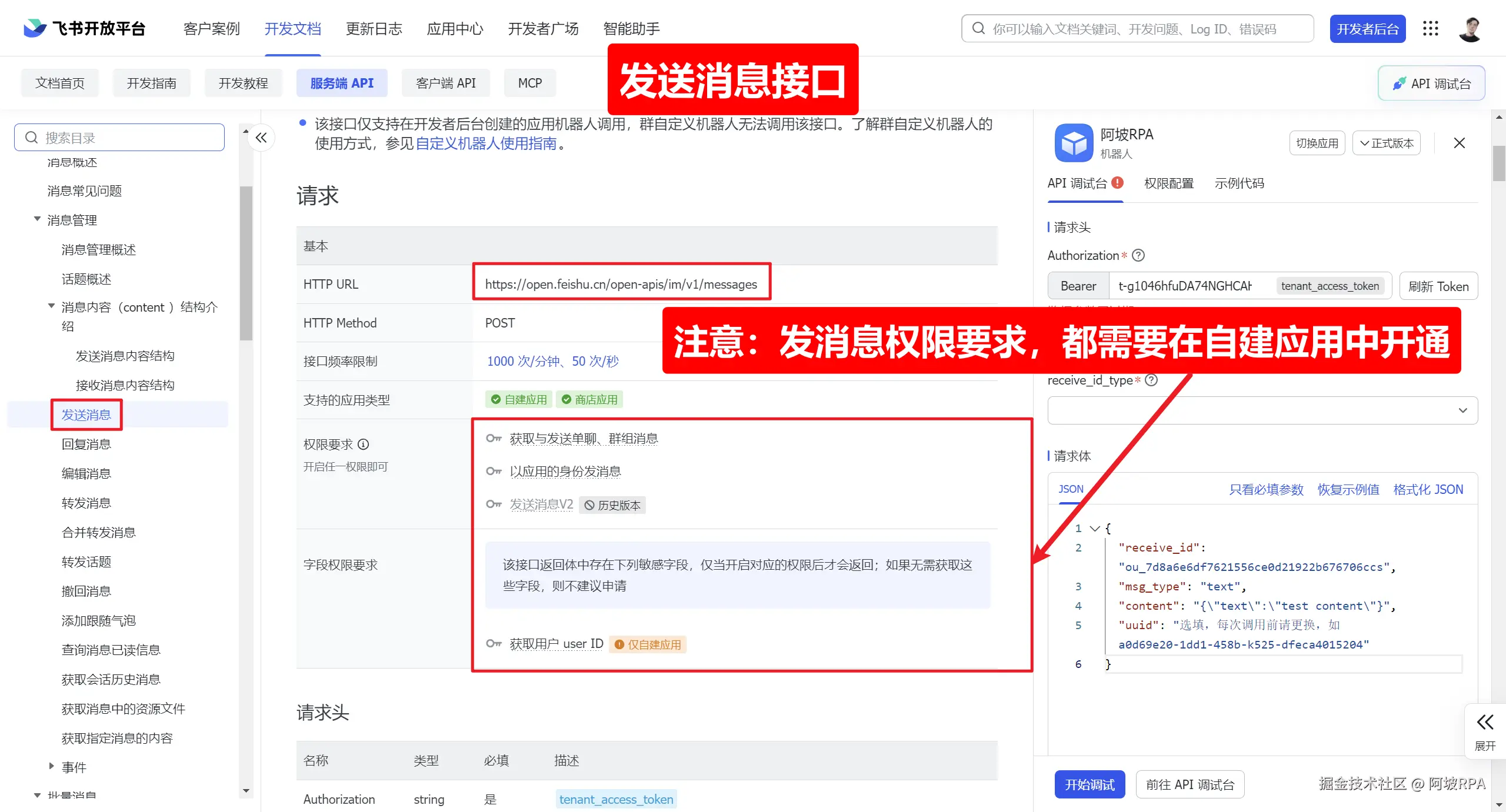 - 发布应用:开启能力,开通权限后,都需要发布版本才能生效,每次新开通权限或添加新能力,都需要重新发版
