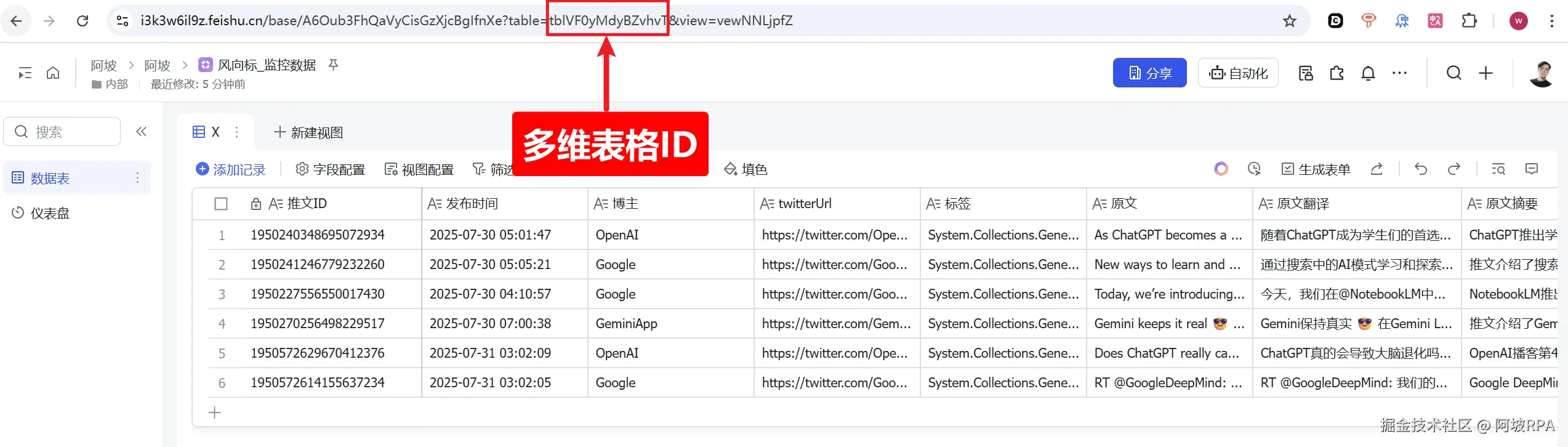 监控最新推文需要创建一个自己的多维表格用来存储监控到的数据,我们用飞书多维表格很方便,他提供了丰富的增删改查接口可供调用,创建多维表格后,有两个参数需要获取一下:多维表格链接