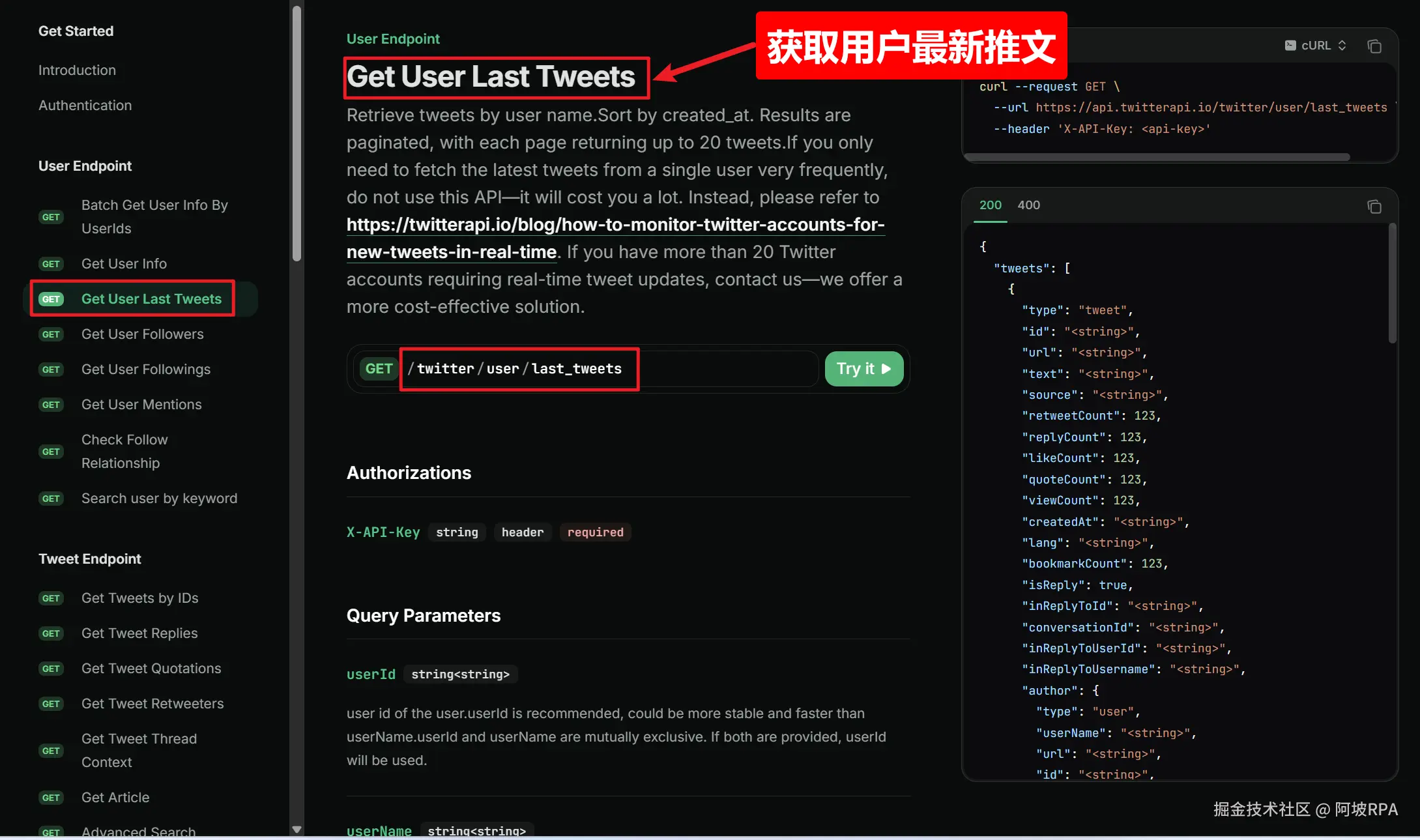 查阅接口文档,需要获取用户最新推文的接口:/twitter/user/last_tweets