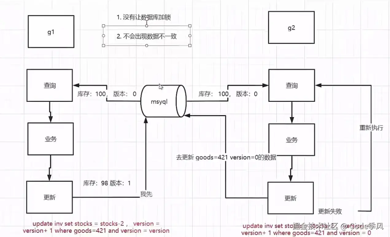 SELECT stocks, version FROM inventory WHERE goods = 1); - 更新资源时,检查版本号是否与查询时一致(如