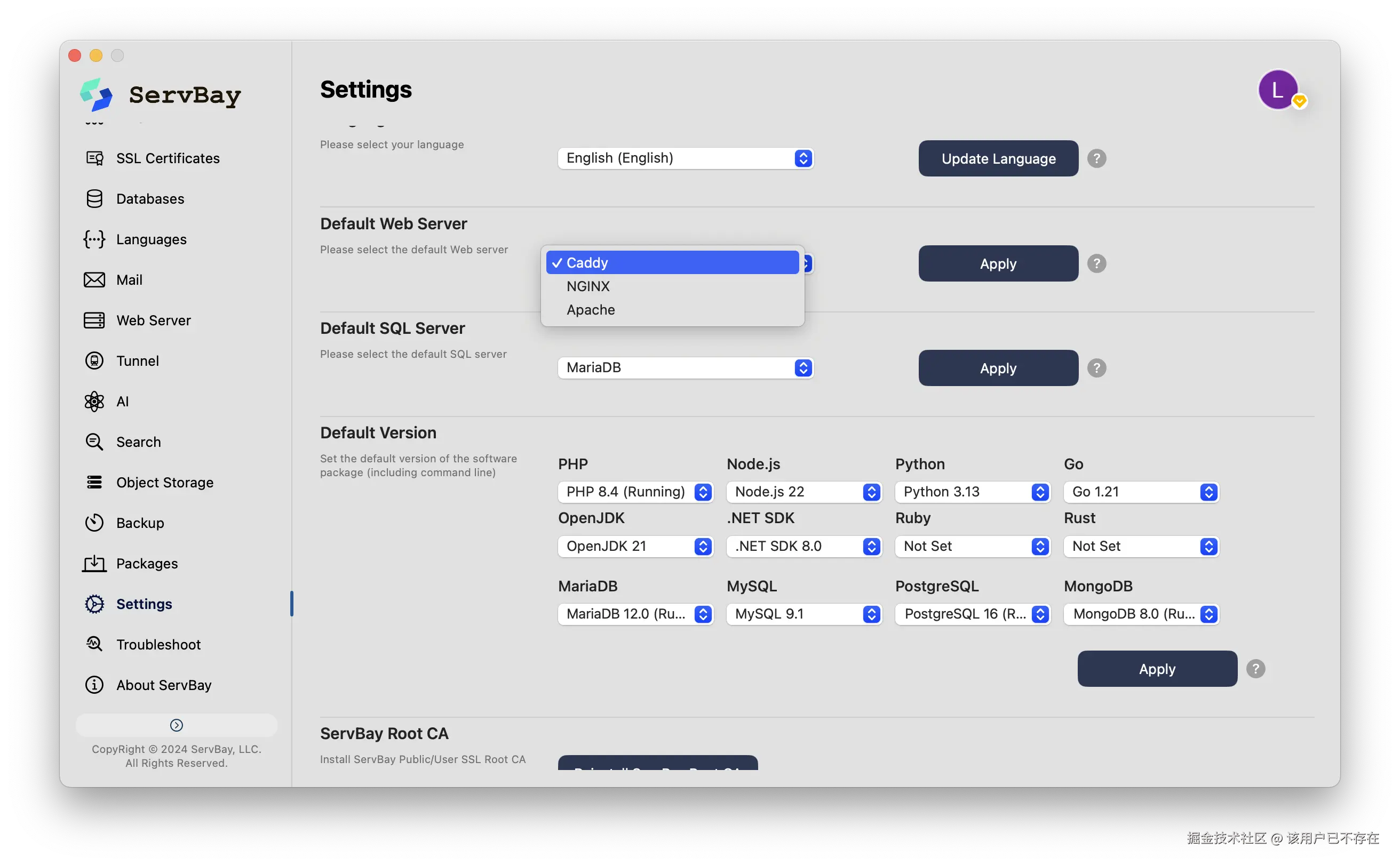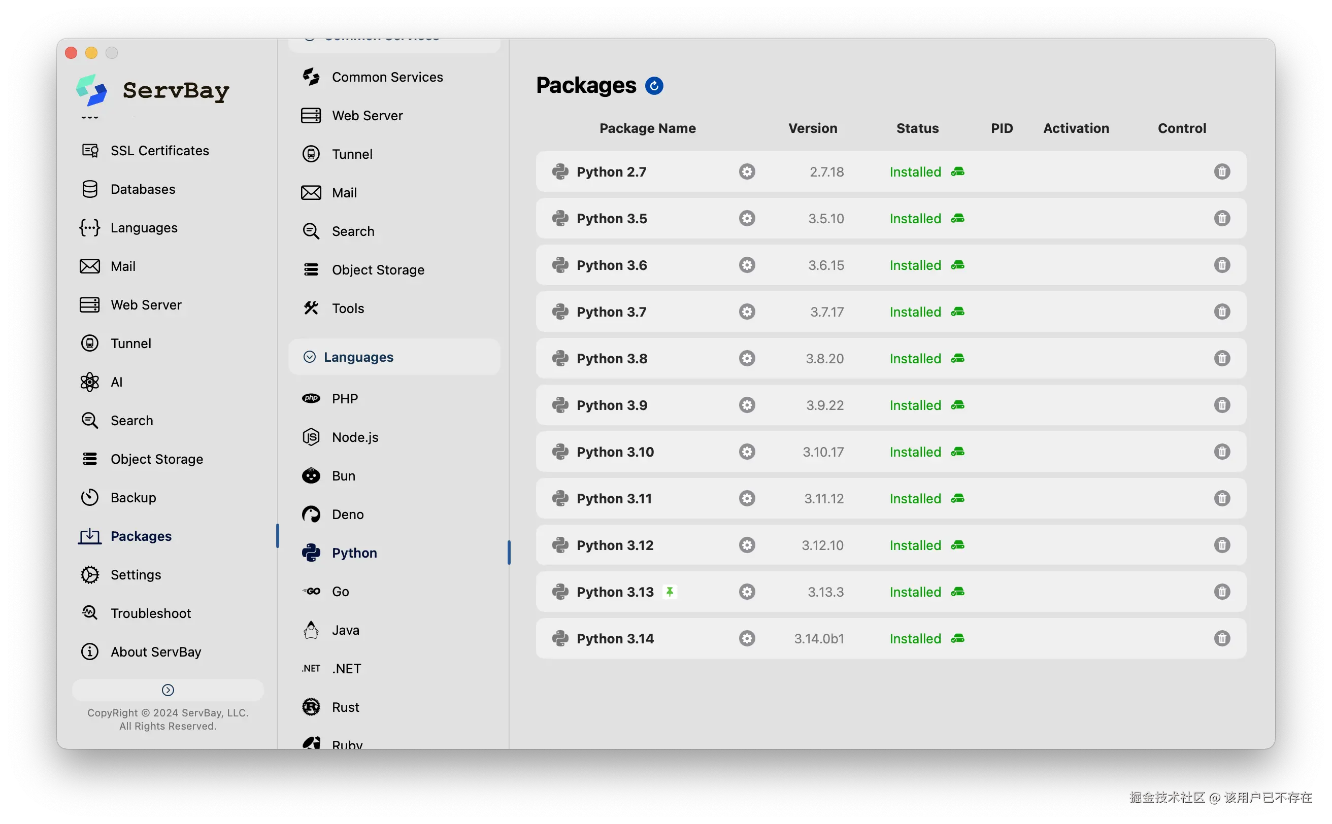 这时,像ServBay这样的本地开发环境集成工具,就显现出它的价值。它并非要取代PyCharm或VSCode,而是为它们提供一个稳定、纯净且随取随用的工作环境。