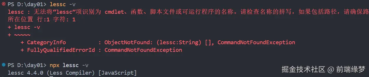 如果配置 packeage.json 脚本,无须使用 npx ,比如 "c": "npx lessc -v",然后运行 npm run c