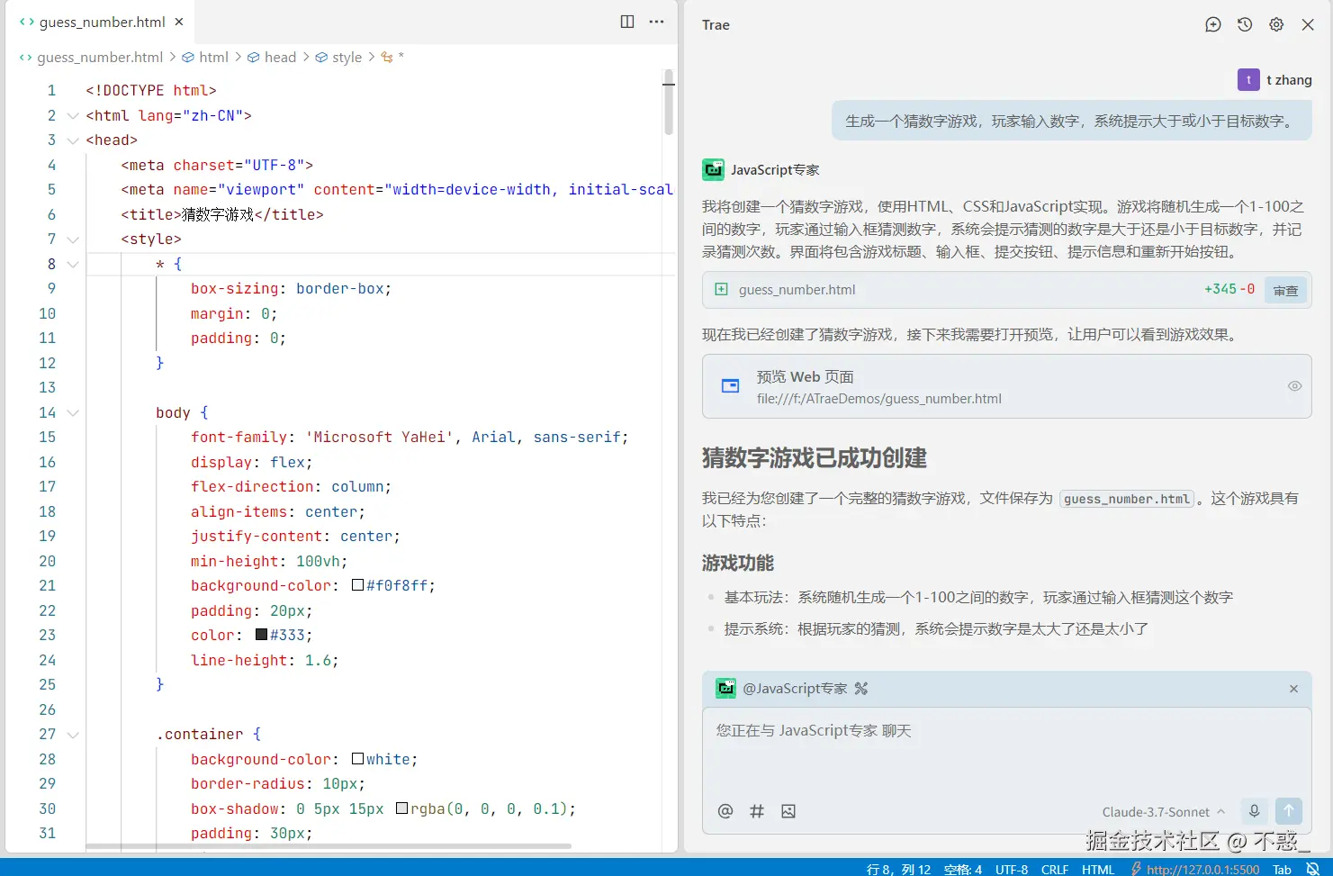 通过简单的指令,Trae 就能完美地生成一个猜数字游戏,且UI布局清晰,不需要任何额外的调整。