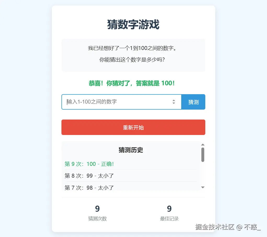 - 输入框和按钮:为玩家提供一个输入框,允许玩家输入猜测的数字,并且生成一个“猜测”按钮来提交数字。