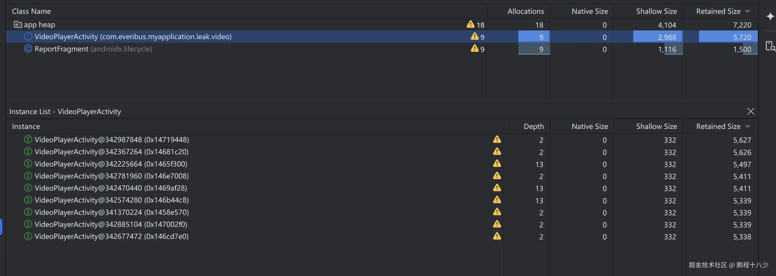 泄漏时:会显示多个残留实例 - 发现 1 个实例(正常应为 0)
