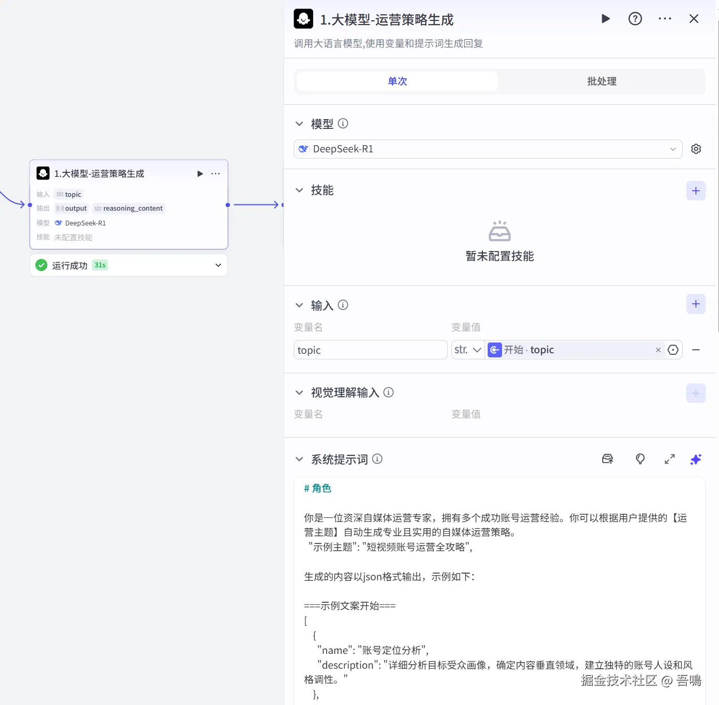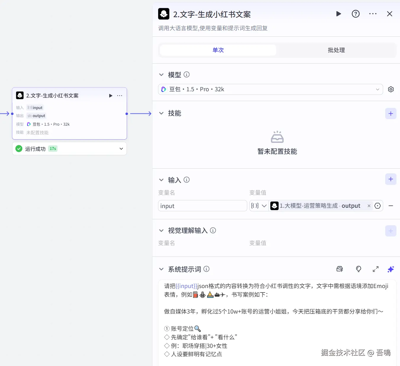 - 功能描述:根据“1.大模型-运营策略生成”节点输出的运营策略,生成一篇小红薯风格的文案(可修改成其他平台风格)