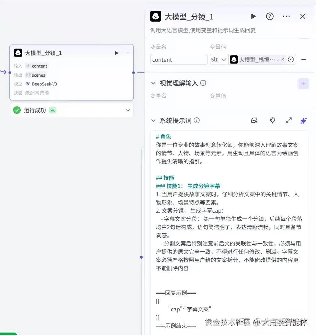 大模型节点根据分镜字幕生成图片提示词。这里系统提示词的内容和生成主角首图的提示词大部分一样,并且给出了输出的示例。
