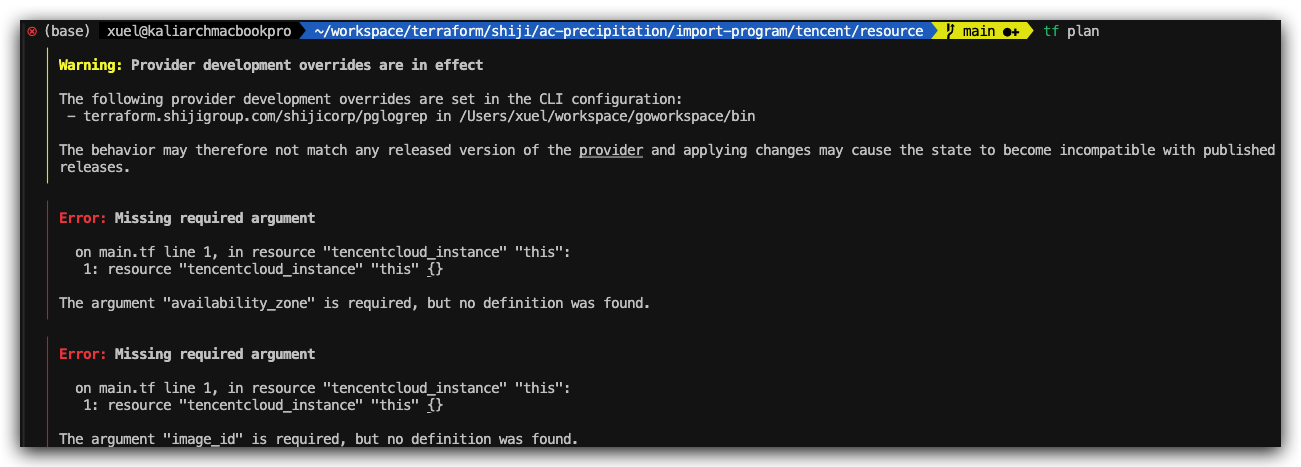 导入后模板与 State 文件存在差异,执行 terraform plan 会提示需更新的属性(黄色警告项)。