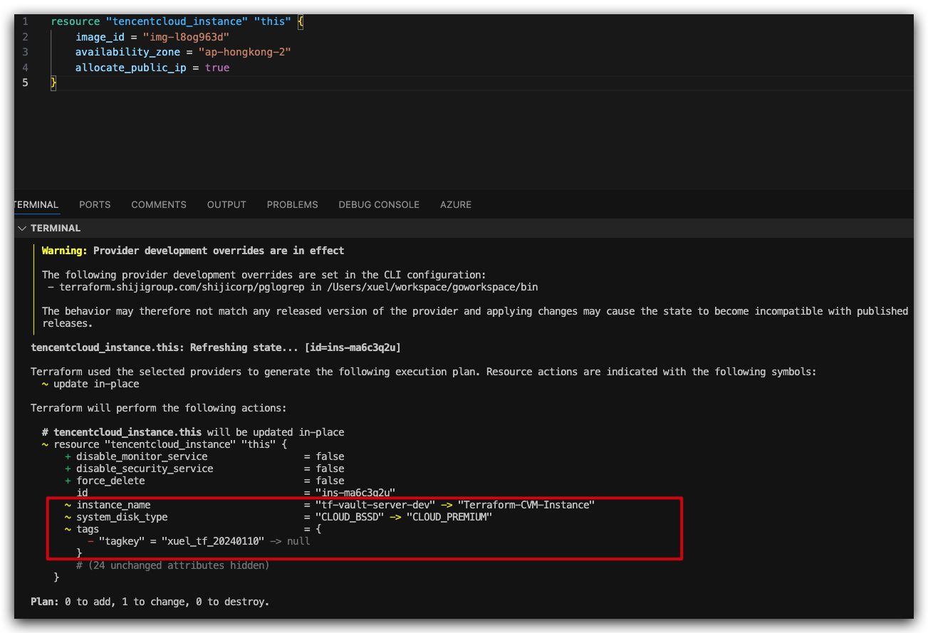 执行 terraform apply 后,控制台将输出资源 ID(如 ins-ma6c3q2u):
