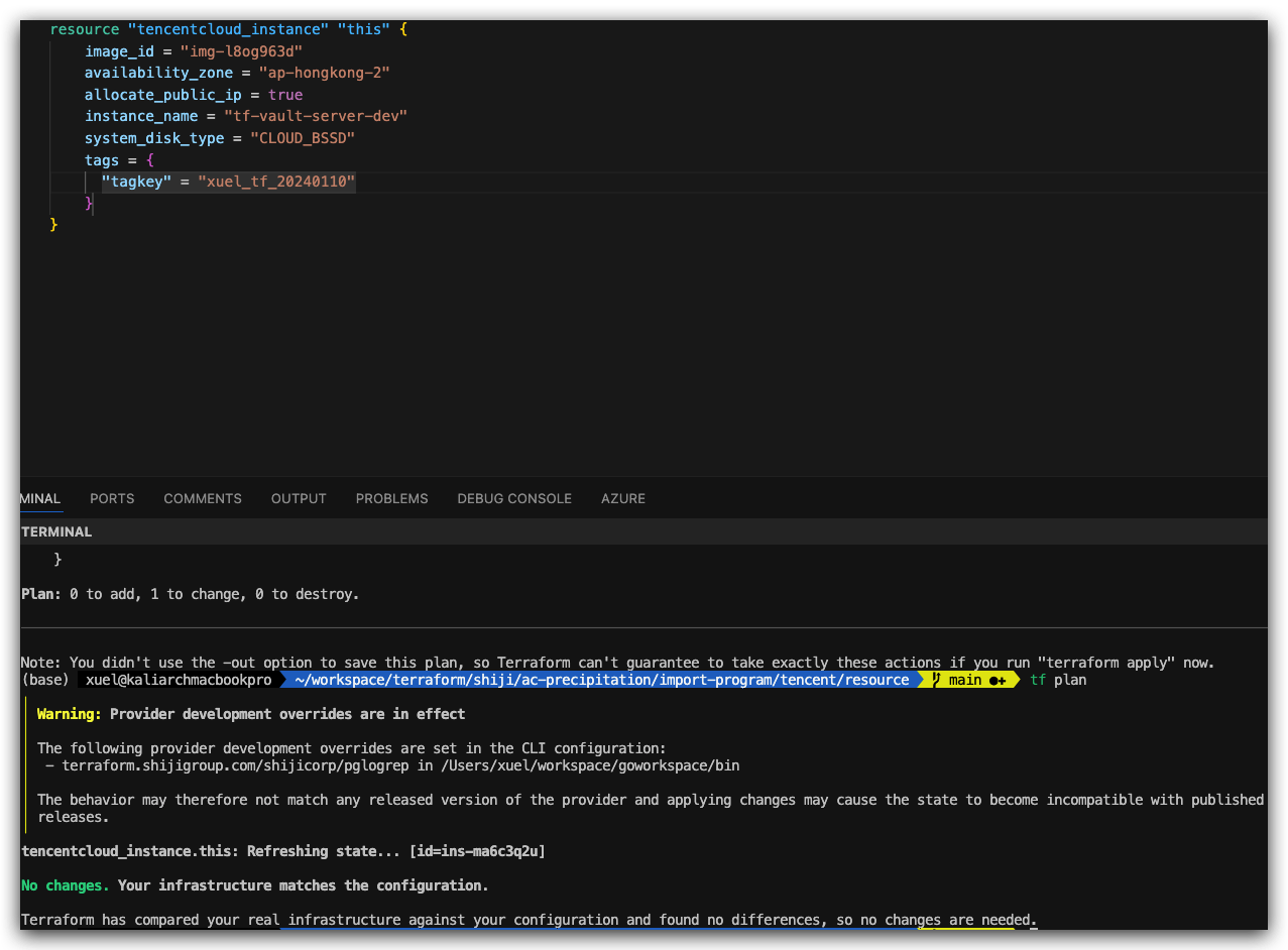 再次执行 terraform plan,若输出 No changes. Your infrastructure matches the configuration.,则表示模板与资源状态完全一致,导入完成。