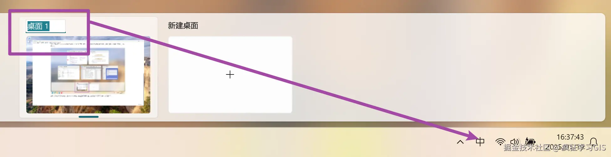 首先,同时按下Windows徽标键与Tab键,打开任务视图;随后,找到当前你正在使用的那个桌面,在其上右键,并选择“重命名”,如下图所示。