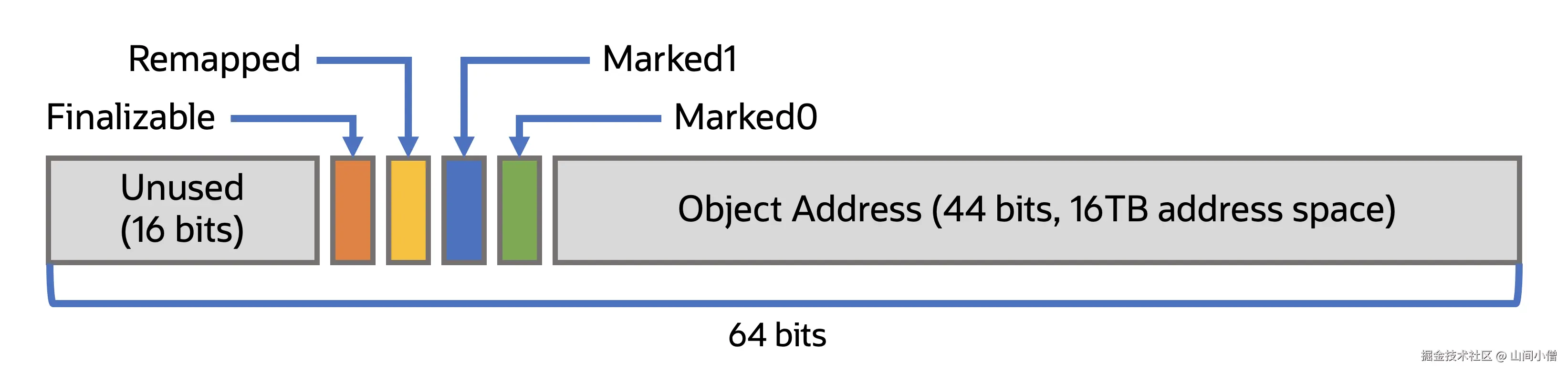 着色指针:核心思想是空间换时间。指针大小为64位,其中内存地址是42为,其他22位可以用来存储信息。目前用了以下4位