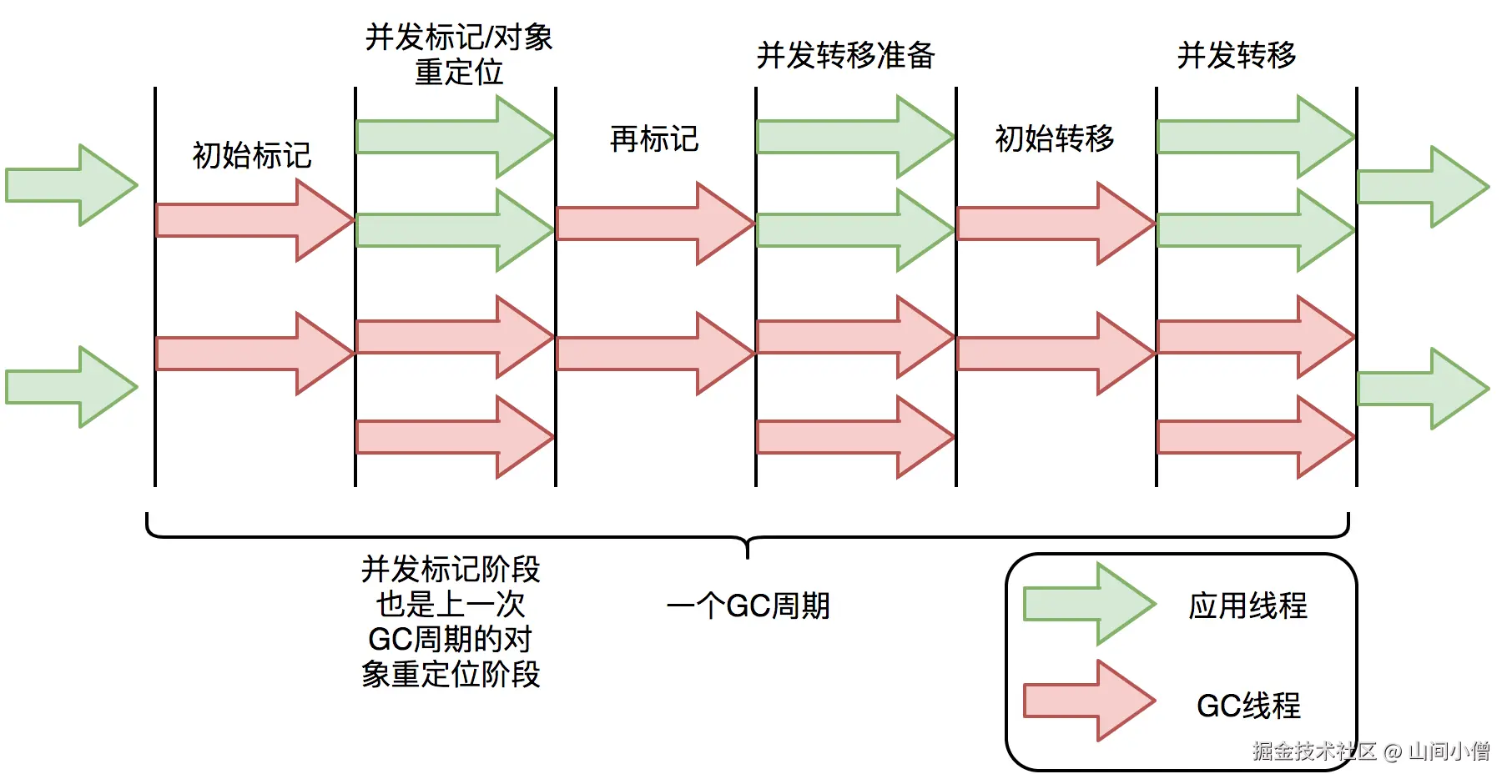 ZGC只有三个STW阶段:初始标记,再标记,初始转移。