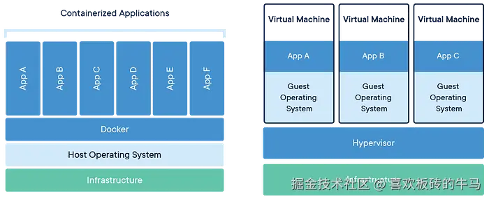 - 传统的虚拟机(VM)会模拟整个硬件堆栈,每个实例都需要单独的客户操作系统,而容器则不同,它们共享主机操作系统内核。
