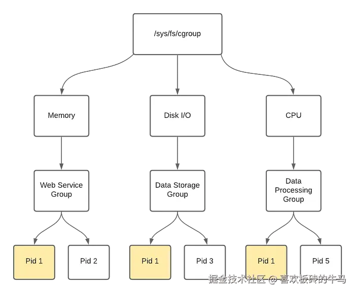 cgroup是一种分层结构,其中/sys/fs/cgroup为根,分支为内存、磁盘 I/O 和 CPU 等资源控制器。这些控制器管理不同进程组的资源分配,将特定进程 ID(PID)与定义的资源限制相关联。来源:Red Hat Developers红帽开发人员