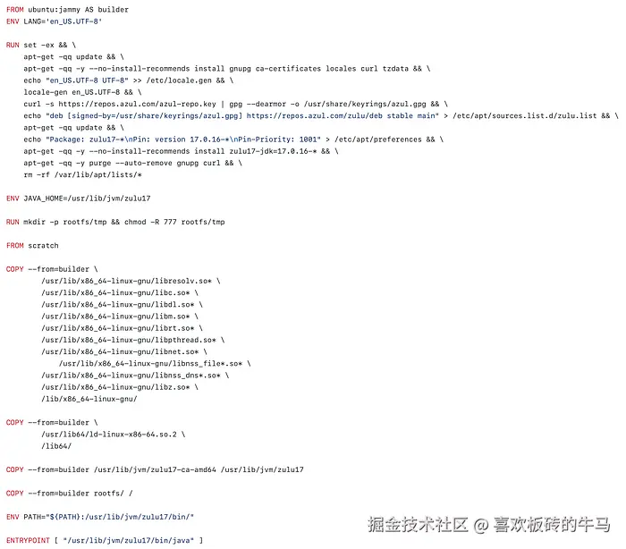 在查看无发行版 Azul JDK 17 镜像的 Dockerfile 时,我们很快就会发现它只复制了 Java 运行时(JVM)所需的基本组件,而没有继承自任何基础镜像。