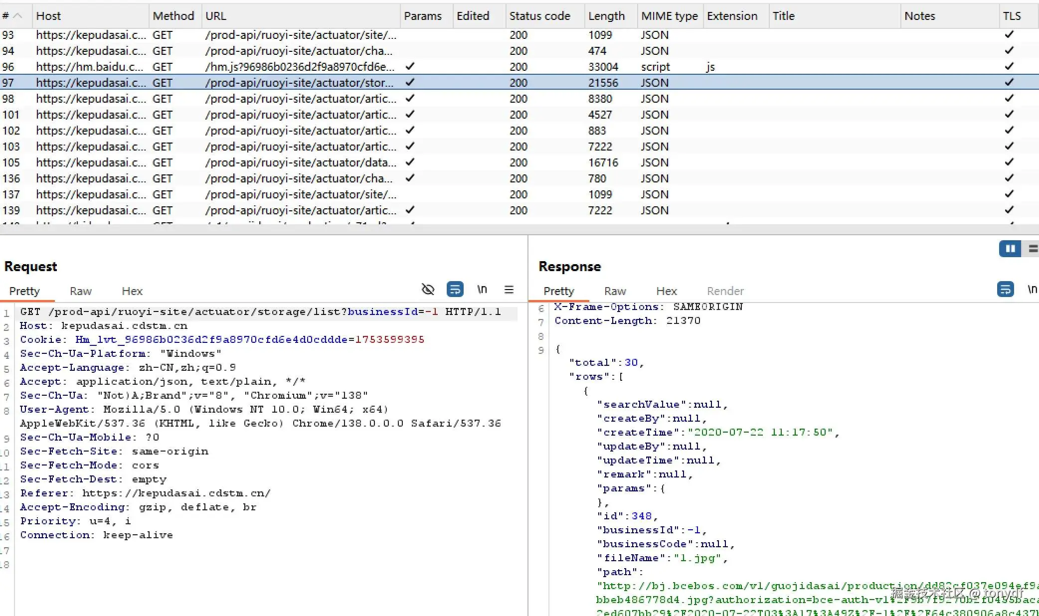打开Burp,我们可以看一下它的数据交互情况,可以看到系统建立许多ws的链接历史,而这里实际上是一个长链接,如下图