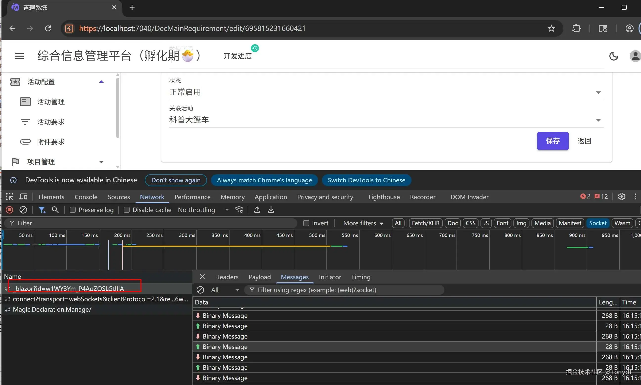 可以看到,尽管网站使用了https协议,但其数据交互信息,在数据发起这边,依旧是明文显示的,也就是你最多只能确保在网络传输层的安全,而黑客依旧是可以通过这次网络抓包工具,完整的获取你的请求参数,并进行一些破坏性的操作。而BlazorServer就不会,你通过抓包工具获取到的信息,也是加密的,这样就提高了数据的安全性。