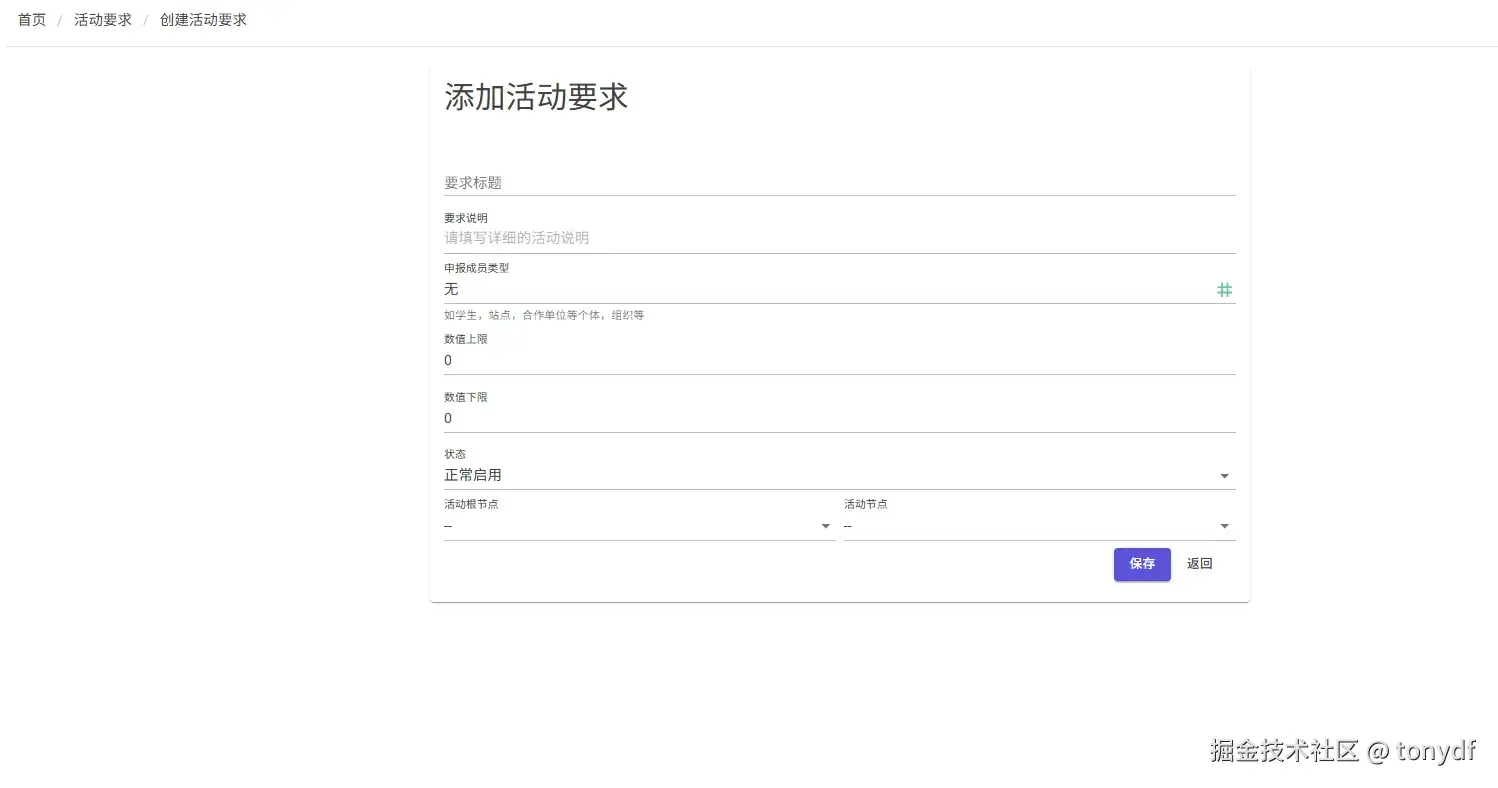 页引入了一些认证授权的东西,这不是本篇重点,不在介绍。下面行就是面包屑组件和我们定义的表单组件了。